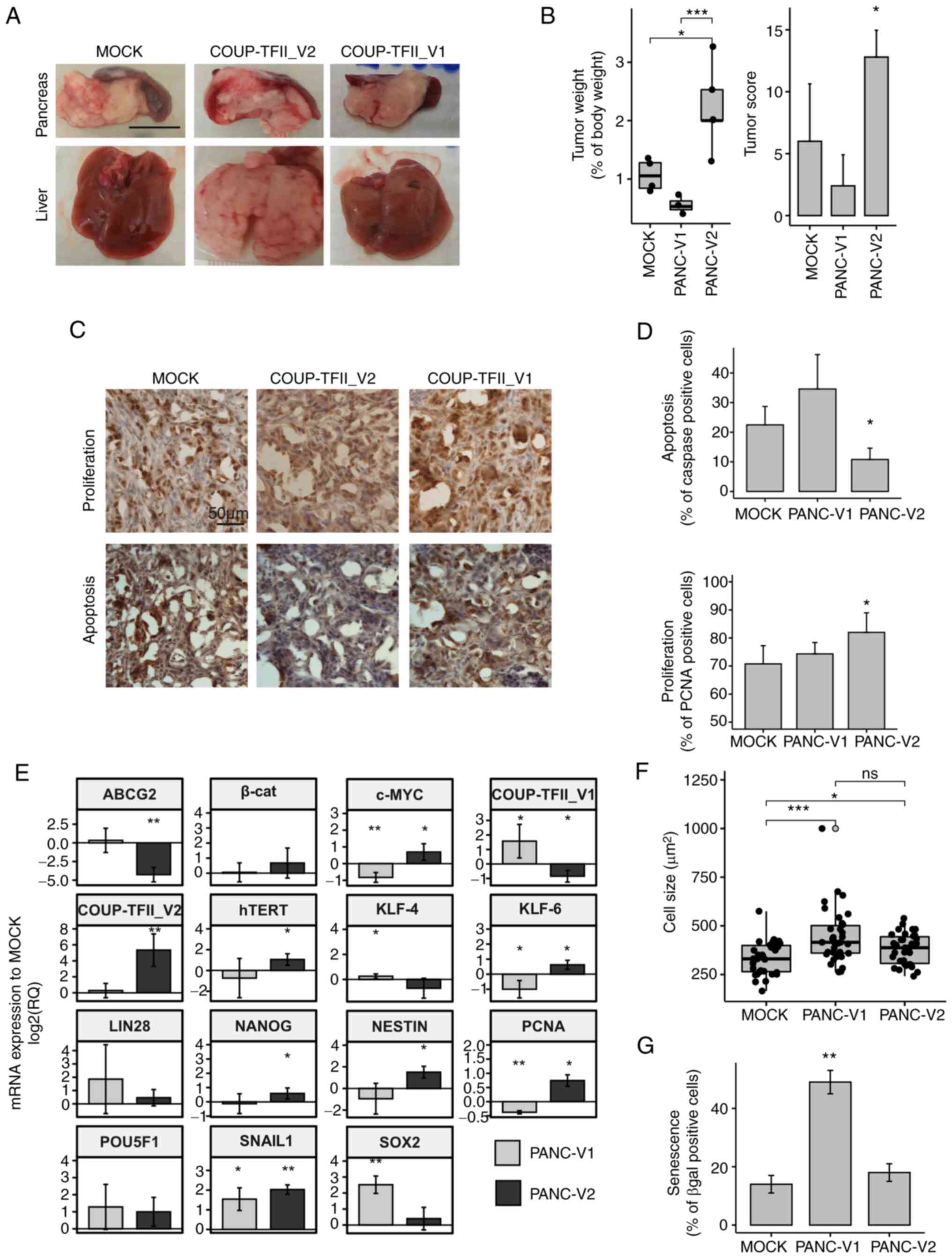To evaluate the different contributions of the two COUP-TFII isoforms in tumor progression, MOCK, PANC-V1 and PANC-V2 cells were implanted in the pancreas of nude mice (Fig. 5A-D). After 2 weeks, the tumor engraftment ratio was 4/5, 3/5 and 5/5 for MOCK, PANC-V1 and PANC-V2 mice, respectively. Of note, 4 out of 5 PANC-V2 xenografts exhibited liver metastasis compared to just 1 in the PANC-MOCK and none in the PANC-V1 group; local diffusion to the adjacent tissues, such as the spleen, was instead present in almost all engrafted animals and the maximum tumor size observed was 18 mm (data not shown). Accordingly, the tumor score and tumor weight were significantly higher for PANC-V2 tumors (P<0.05 vs. PANC-V1 and MOCK tumor-bearing mice) (Fig. 5B). Immunostaining for PCNA and activated Caspase 3/7 of the tumors indicated that proliferation and apoptosis were significantly altered in PANC-V2-bearing mice (Fig. 5C and D). No clear differences in stromal reaction (as demonstrated by Sirius Red Collagen staining and quantification) and stromal infiltration were detected (Fig. S9).