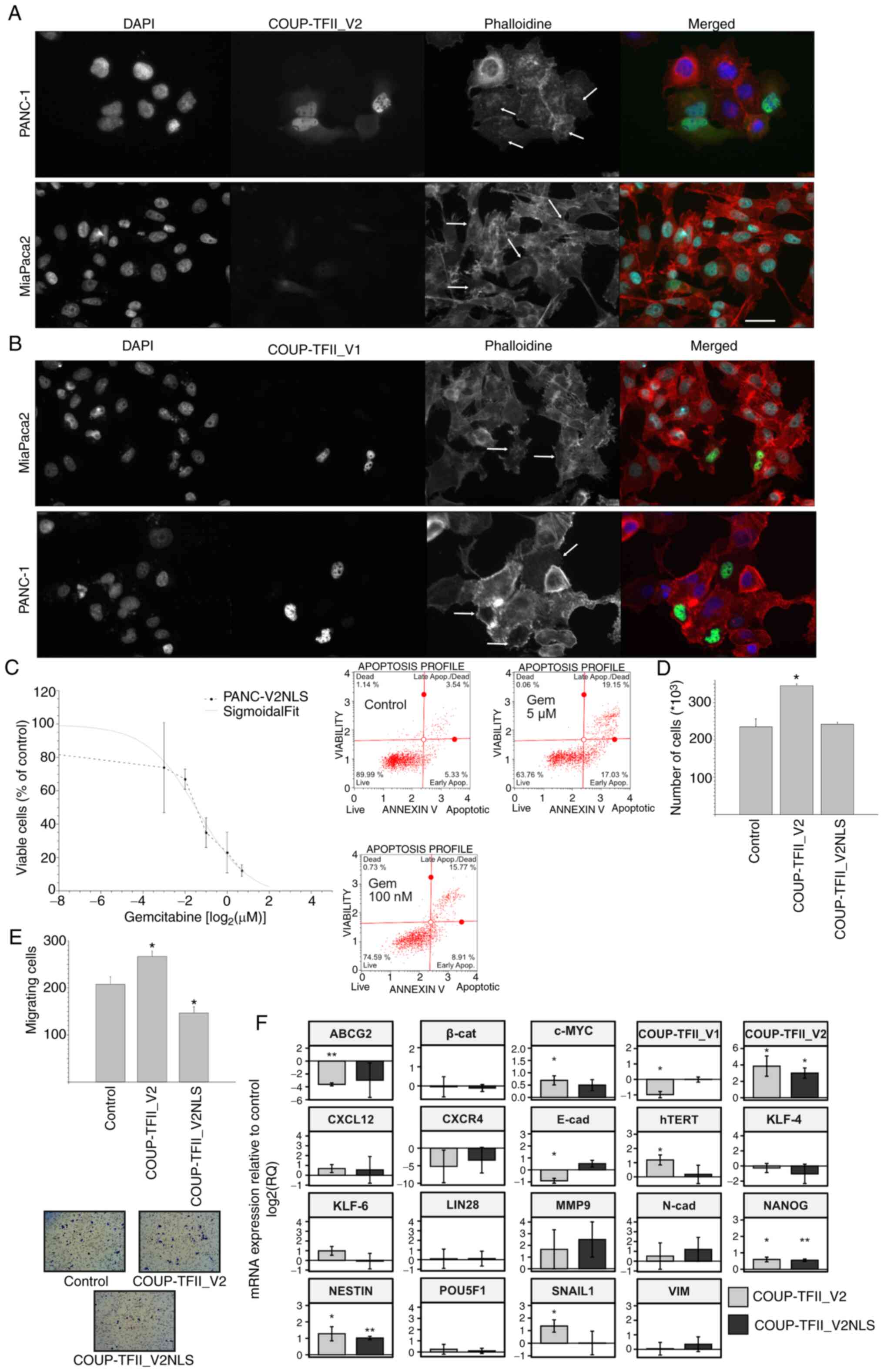 COUP-TFII_V2 localization was observed to be associated with a modification of cell shape and acquisition of EMT characteristics (Fig. 7). After COUP-TFII_V2-EGFP transfection, MiaPaca2 and PANC-1 EGFP-positive cells exhibited differences in cell shape linked to the level of nuclear/cytoplasmic expression of COUP-TFII_V2 (Figs. 7A and B and S14). Accordingly, cells with mostly cytosolic COUP-TFII_V2 exhibited a pronounced mesenchymal-like phenotype (e.g., well-organized cytoskeleton or cell protrusion), while this was reduced in cells with nuclear COUP-TFII_V2, suggesting that its nuclear exclusion may potentiate EMT. To validate the hypothesis that nuclear COUP-TFII_V2 limits EMT, COUP-TFII_V2 was modified by adding an NLS to obtain the COUP-TFII_V2NLS. As indicated in Figs. 7C-F and S14, COUP-TFII_V2NLS reduced cell proliferation, cell invasion, motility and drug resistance, compared to wild-type COUP-TFII_V2-transfected cells. Of note, unlike COUP-TFII_V2, COUP-TFII_V2NLS failed to reduce the expression of COUP-TFII_V1.