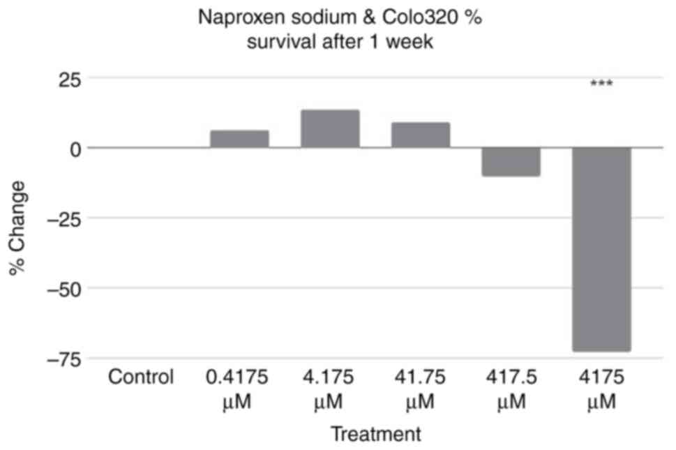 Naproxen (NS) is typically known for its use as a non-steroidal anti-inflammatory drug (NSAID) and has been a subject of research due to its potential use as a medical treatment in the form of chemotherapy. In 2014, a study by the Women's Health Initiative (3) concluded that NSAIDs were associated with reduced risks of colorectal cancer and could have chemopreventive effects. Possible chemopreventive effects of a hydrogen sulfide-releasing NS were also supported by a study that used a xenograft mouse model. The study also revealed that NS could inhibit growth via downregulation of NF-κB (4). In 2019, an in vivo study on rats further demonstrated the potential for aspirin and NS to fight colorectal cancer, including through enabling apoptosis via caspase-3(5). A previous study on the effects of NS in patients with Lynch syndrome, which increases the probability of developing colorectal cancer, found that NS was safe to use, boosted immune activity in humans and exerted chemopreventive effects in mice (6). While studies such as the aforementioned ones have demonstrated that NS may have chemopreventive properties, fewer studies have analyzed the association between NS and the activation of specific pathways in colon cells, such as apoptosis. In the present study, it was hypothesized that NS may have a variety of beneficial effects in fighting and limiting colorectal cancer. The present study aimed to reveal the impacts of NS on relevant biological cell pathways and its effects on cancer cell survival and proliferation.