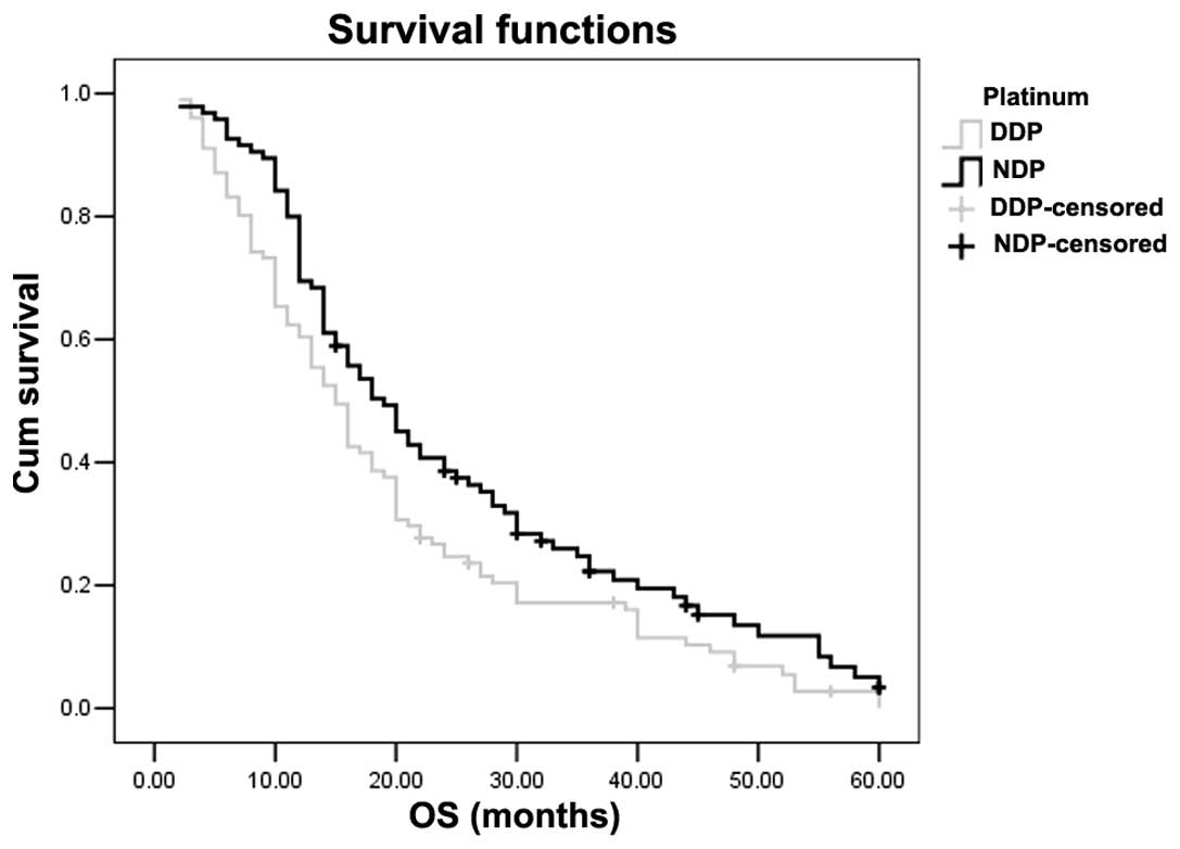 In conclusion, NDP-based chemotherapy prolongs the median survival time of NSCLC patients, compared to DDP-based chemotherapy. The observed survival benefit is due to the reduced toxicity of NDP, which allows patients to tolerate more cycles of chemotherapy. A slow toxicity and high life quality were the tendencies of the advanced cancer treatment currently. Thus, NDP may be a more reasonable choice than DDP in clinical practice. In addition, noteworthy information is also provided regarding the impact of gender, age and histological type, which may improve treatments by targeting specific patient populations.
