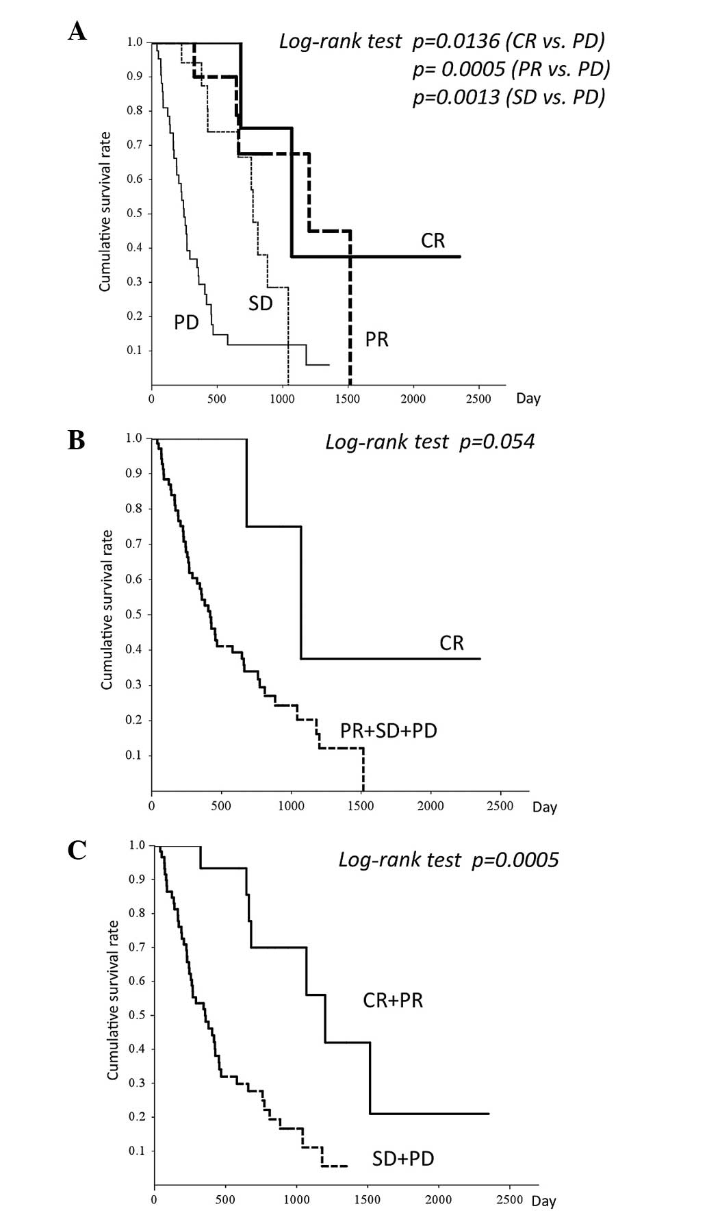 Fig. 1 shows that the median overall survival of each group was 1,069, 1,201, 773 and 245 days for those who achieved CR, PR, SD and PD, respectively. Overall survival was longer for the CR compared to the PR+SD+PD group (P=0.054) and significantly longer for the CR+PR, compared to the SD+PD group (P=0.0005).