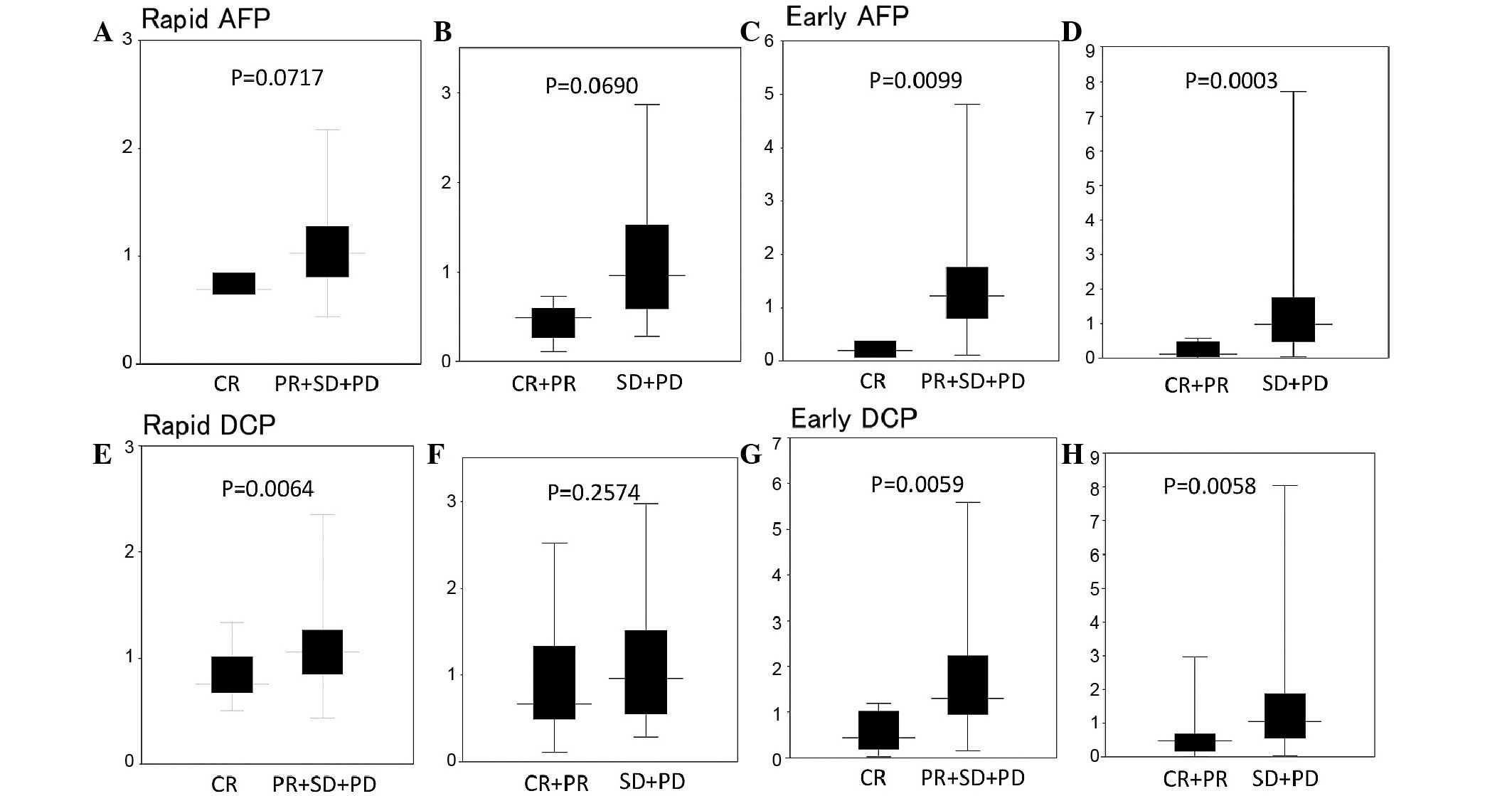 Data were statistically analyzed using Stat Flex version 6 (Artech, Osaka, Japan). A two-sided P<0.05 was considered to indicate a statistically significant difference. The amount of change in AFP and DCP between the CR and PR+SD+PD, and between the CR+PR and SD+PD groups was compared using the Mann-Whitney U test and categorical variables were compared using the Kruskal-Wallis test. Overall survival was calculated using the Kaplan-Meier method and compared using the log-rank test. Sensitivity, specificity, positive predictive values (PPV) and negative predictive values were determined from receiver operating characteristic (ROC) curves.