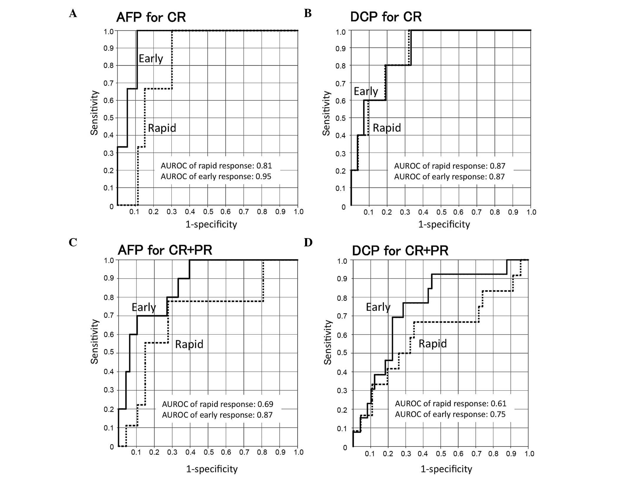 Fig. 3 shows the ROC curves for treatment responses (CR vs. PR+SD+PD and CR+PR vs. SD+PD). The areas under the ROC curves of early AFP or DCP responses were larger for the CR than for the CR+PR group. The sensitivity and specificity for the CR group were 0.67 and 0.85 for a rapid AFP response (cut-off, 0.72), 1.00 and 0.89 for an early AFP response (cut-off, 0.46), 0.80 and 0.81 for a rapid DCP response (cut-off, 0.55) and 0.80 and 0.81 for an early DCP response (cut-off, 0.45), respectively. The sensitivity and specificity for the CR+PR groups were 0.78 and 0.72 for a rapid AFP response (cut-off, 0.92), 0.80 and 0.73 for an early AFP response (cut-off, 1.02), 0.67 and 0.65 for a rapid DCP response (cut-off, 0.77) and 0.77 and 0.71 for an early DCP response (cut-off, 0.61), respectively (Table III).
