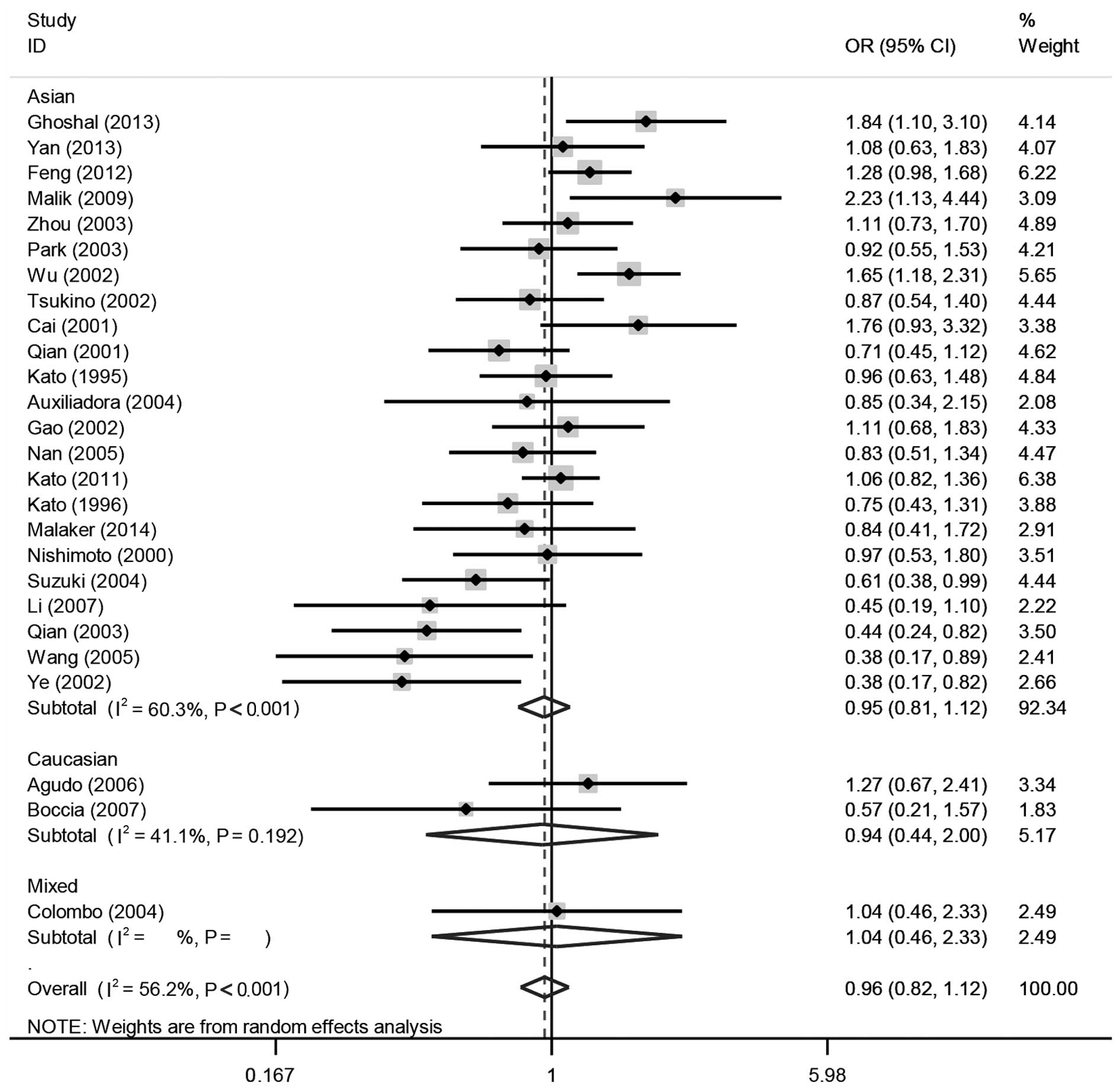 In the meta-analysis, the I2 value was used to confirm heterogeneity (46), with values <25, 25–50 and >50% indicating low, moderate and high heterogeneity, respectively. A χ2-based Q test was also used for the heterogeneity test (Ph), together with the random-effect model, in order to obtain a relatively conservative outcome (47). The significance of the pooled ORs and their 95% CIs were determined using the Z test. A Pearson's χ2 test was used for assessing the HWE.