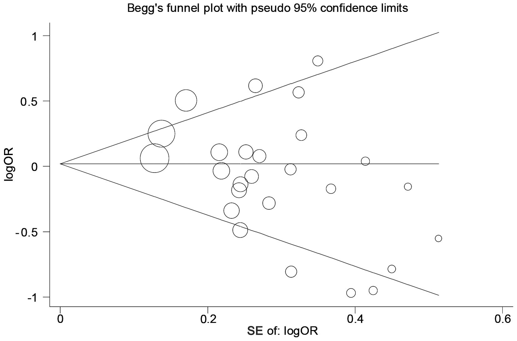 Begg and Mazumdar's adjusted rank correlation test and the Egger regression asymmetry test were each used to examine the publication bias, as well as funnel plots. The results revealed that no publication bias was observed in RsaI/PstI (Fig. 4) and DraI studies. Publication bias occurred in the studies of RsaI/PstI [Egger's test: P=0.033 in the dominant model (C1C2 + C2C2, vs. C1C1)], while no publication bias was observed in the DraI studies.