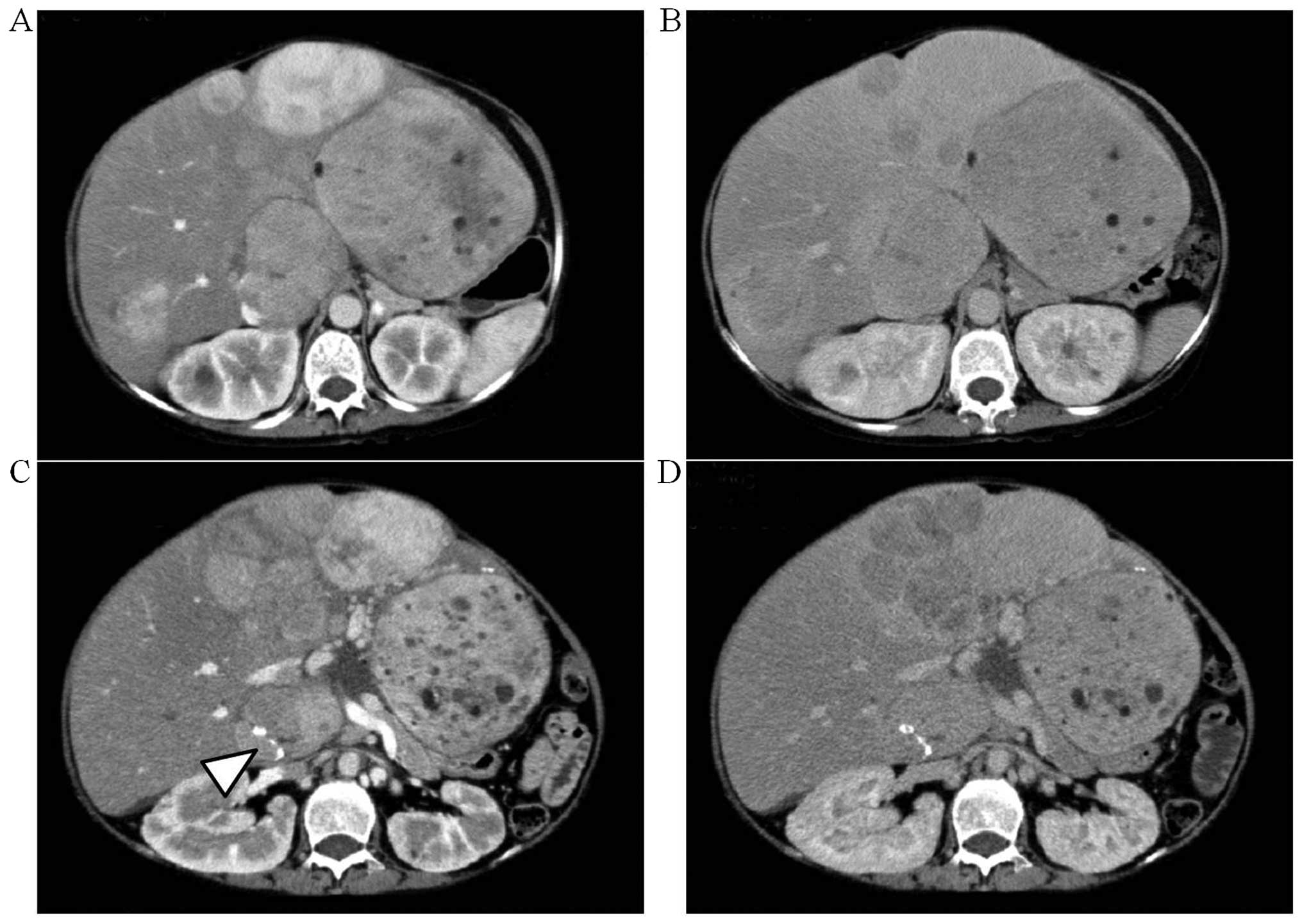 Computed tomography (CT) scans taken (A and B) at the first consult and (C and D) on the preoperative day. (A and C) Early-phase and (B and D) delayed-phase tumors. The size and number of tumors in the medial segment had increased significantly and calcification was found in the tumor of S1 (arrowhead).