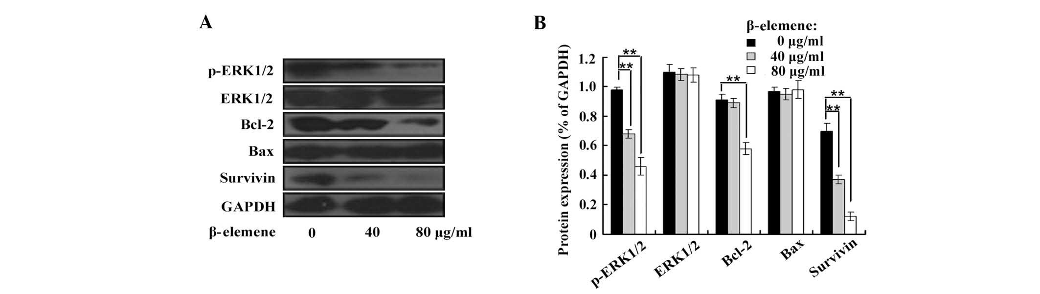 To investigate the role of the ERK1/2 signalling pathway in the antiproliferative effect of β-elemene on glioblastoma cells, the expression levels of p-ERK1/2, ERK1/2, Bcl-2, Bax and survivin were examined by western blot analysis in β-elemene-treated U87 cells (Fig. 2). β-elemene decreased the expression of p-ERK1/2, Bcl-2 and survivin in human U87 cells. By contrast, β-elemene did not affect the expression levels of total ERK1/2 and Bax.