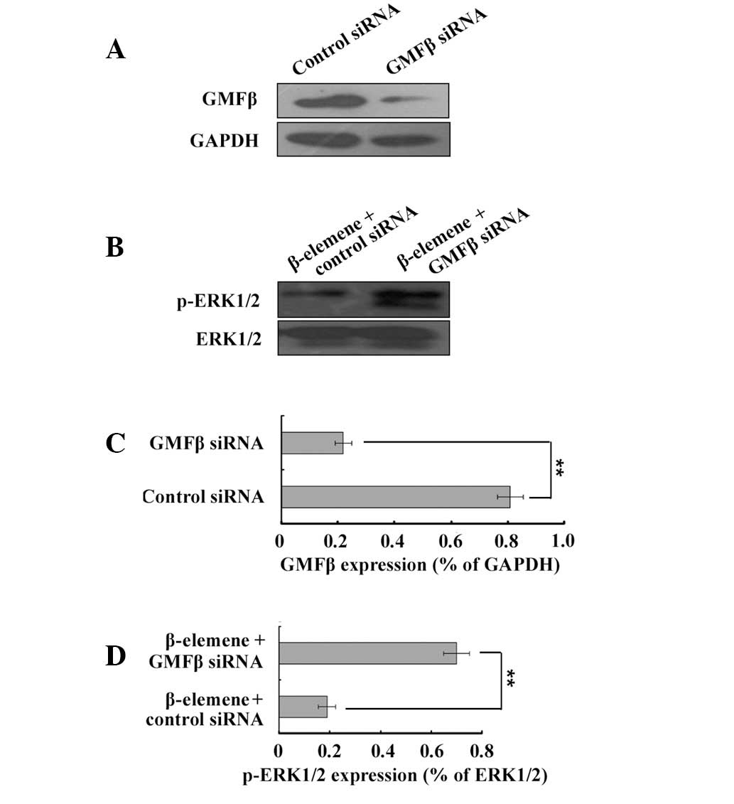 A previous study by our group reported that β-elemene inhibited the proliferation of U87 cells via activation of the GMFβ-MKK3/6-p38 signalling pathway (6–8). Several studies have demonstrated that the overexpression of GMFβ simultaneously activates p38 and inhibits the activity of ERK1/2 in C6 glioblastoma cells (17,18). To investigate the correlation between the GMFβ and the ERK1/2 pathway in the antiproliferative effect of β-elemene, RNA interference was performed using GMFβ siRNA to downregulate GMFβ expression in the U87 cells. The interference efficiency was determined by western blot analysis (Fig. 4A and C). U87 cells were then treated with 80 μg/ml β-elemene for 24 h and the expression levels of p-ERK1/2 were detected by western blot analysis (Fig. 4B and D). Transfection with 53 nM GMFβ siRNA for 24 h significantly decreased the expression of GMFβ. The p-ERK1/2 levels were increased in the GMFβ siRNA group as compared with those in the control group. Silencing of GMFβ decreased the inactivating action of β-elemene on the ERK1/2 pathway. In conclusion, the inactivation of ERK1/2 depends on GMFβ activation and mediates the antiproliferative effect of β-elemene on glioblastoma.