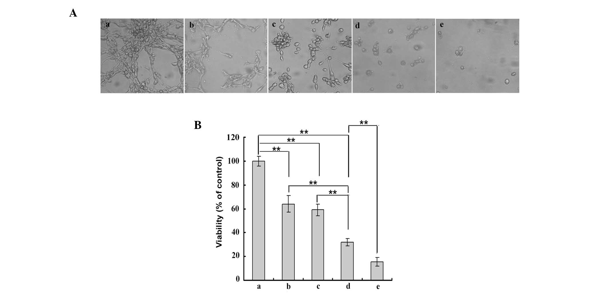 Values are expressed as the mean ± standard deviation of at least three independent experiments. Statistical analysis was performed using Student’s t-test. A level of P<0.05 was considered to indicate a statistically significant difference between groups and P<0.01 was considered to indicate a highly significant difference. Statistical analysis was performed with SPSS software version 16.0 (SPSS, Inc., Chicago, IL, USA).