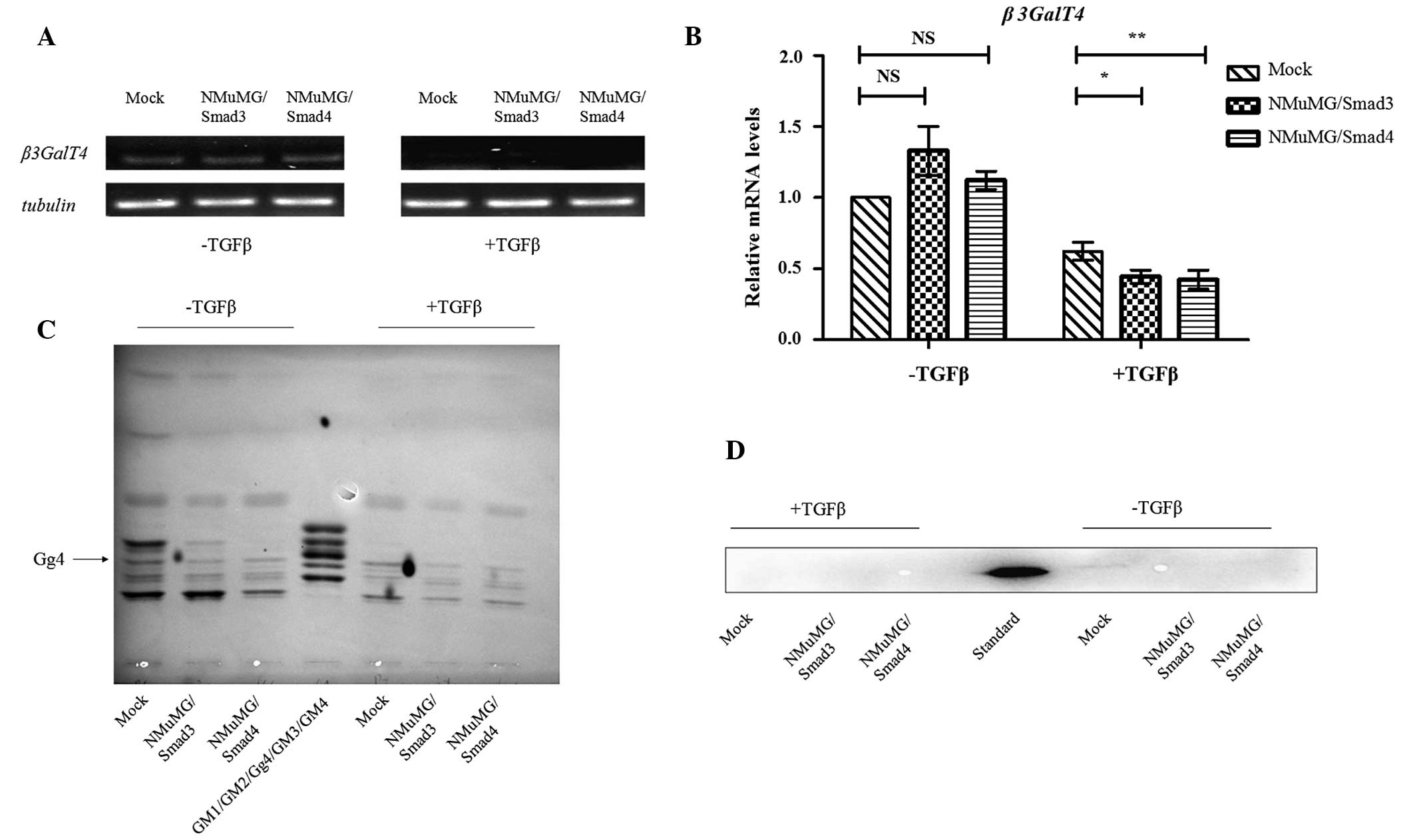 In conclusion, the present study demonstrated that the activated Smad3/4 complex downregulated the expression of the β3GalT4 gene responsible for ganglioside expression through translocation into the nucleus and binding to the β3GalT4 promoter. The findings of the present study suggest that Gg4 is important in the TGFβ/Smads signaling pathway. Subsequent studies are required to assess this hypothesis and to elucidate the mechanisms whereby Gg4 and other GSLs are involved in the TGFβ-mediated EMT processes.