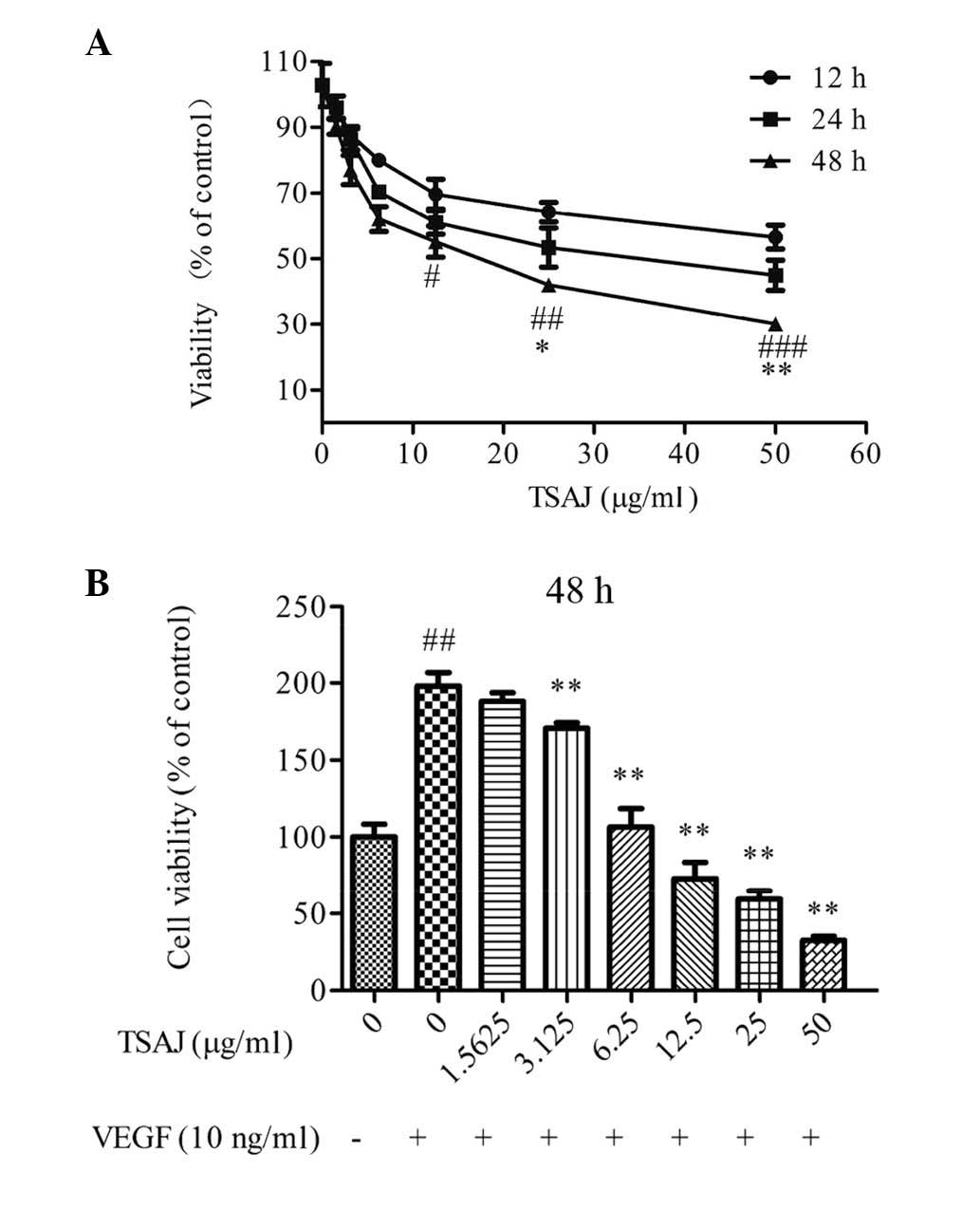 The effects of TSAJ on VEGF-induced cell viability were determined as described by previous methods (22). Briefly, the Ea.hy926 cells (6×103 cells/well) were seeded in 96-well cell plates and cultured in normal growth medium for 24 h. Subsequently, the cells were exposed to various concentrations of TSAJ (0, 0.78125, 1.5625, 3.125, 6.25, 12.5, 25, and 50 μg/ml), with or without VEGF (10 ng/ml), for 48 h in DMEM supplemented with 5% FBS. The medium was then replaced with DMEM containing 10% CCK-8. Following a 2 h incubation at 37°C, the absorbance of the resulting product was measured at 450 nm, using an ELISA microplate reader (Labsystem, USA). The percentage viability of the cells was then calculated. At least three independent experiments were performed. The control group, which did not receive VEGF or TSAJ treatment, was set at 100%.