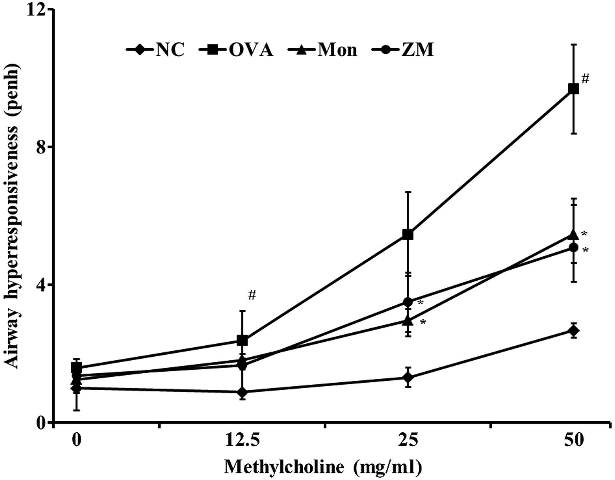 The OVA-induced mice exhibited a significant increase in AHR with increasing concentrations of methylcholine exposure, compared with the normal control mice. The montelukast-treated mice exhibited significantly reduced AHR, compared with the OVA-induced mice. The ZM-treated mice also exhibited decreased AHR at methylcholine concentrations of 25 and 50 mg/ml, compared with the OVA-challenged mice. These reductions were similar to the results observed in the montelukast-treated mice (Fig. 1).