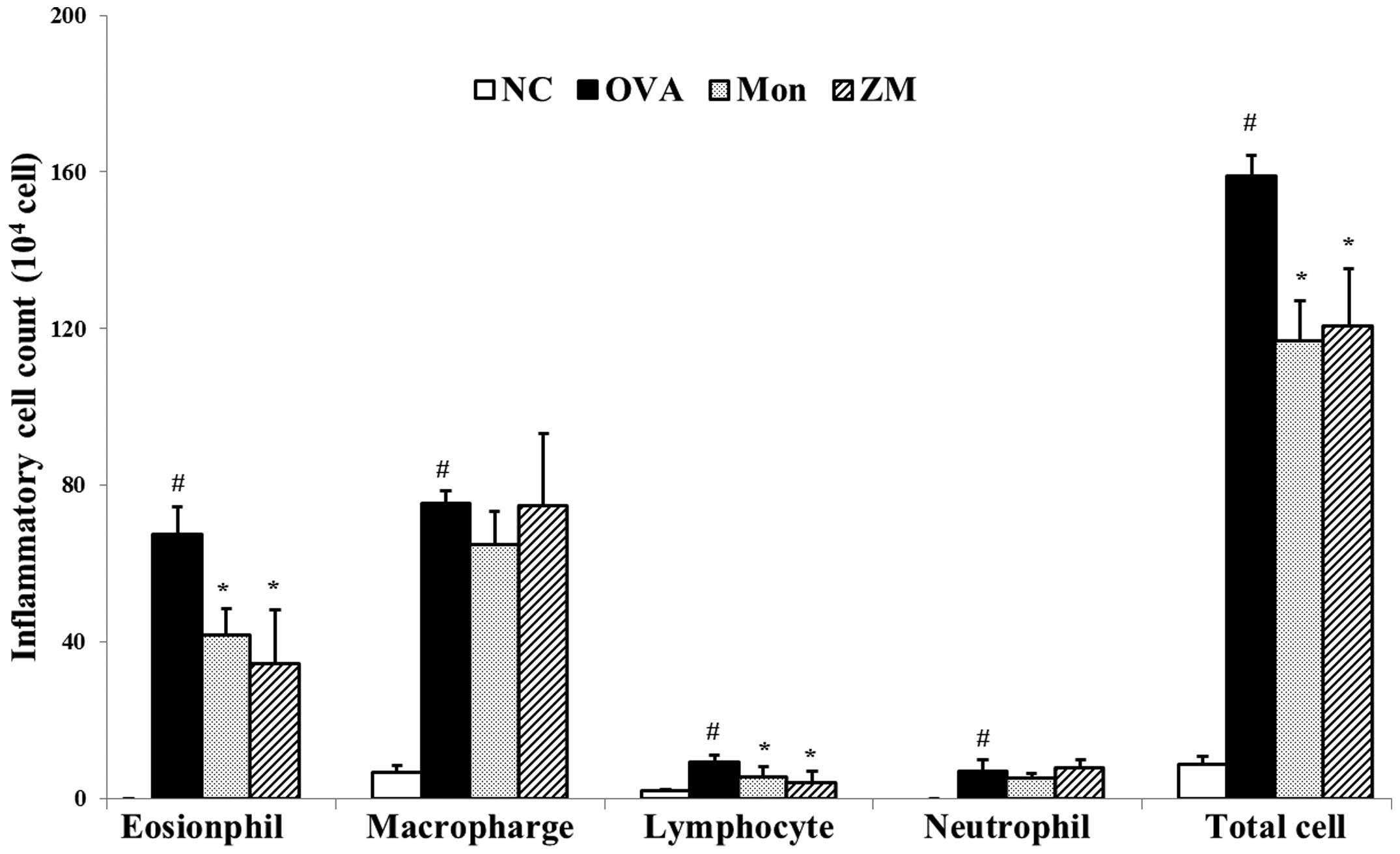 The mice were divided into four groups (n=7): Normal control, PBS sensitization/challenge; OVA, OVA sensitization/challenge + PBS; Mon, OVA sensitization/challenge + montelukast (30 mg/kg; Sigma-Aldrich, St. Louis, MO, USA); ZM, OVA sensitization/challenge + ZM (30 mg/kg). Airway inflammation was induced by an OVA (Sigma-Aldrich) challenge. Each mouse was immunized by an intraperitoneal injection of 20 µg OVA, emulsified with 2 mg aluminum hydroxide (Thermo Fisher Scientific, Waltham, MA, USA) in 200 µl PBS (pH 7.4), on days 0 and 14. On days 21, 22 and 23 the mice were exposed, by inhalation, to 1% (w/v) OVA aerosolized solution using an ultrasonic nebulizer (NE-U12; Omron Corp., Tokyo, Japan) for 1 h. The ZM groups of asthma-induced mice were treated orally with 30 mg/kg ZM, or with an oral injection of 30 mg/kg montelukast 1 h prior to the OVA challenge. Montelukast is a cysteinyl leukotriene (cys-LT)-1 receptor agonist, and was used as a positive control in the present study. The control mice were treated orally with an equivalent volume of PBS.