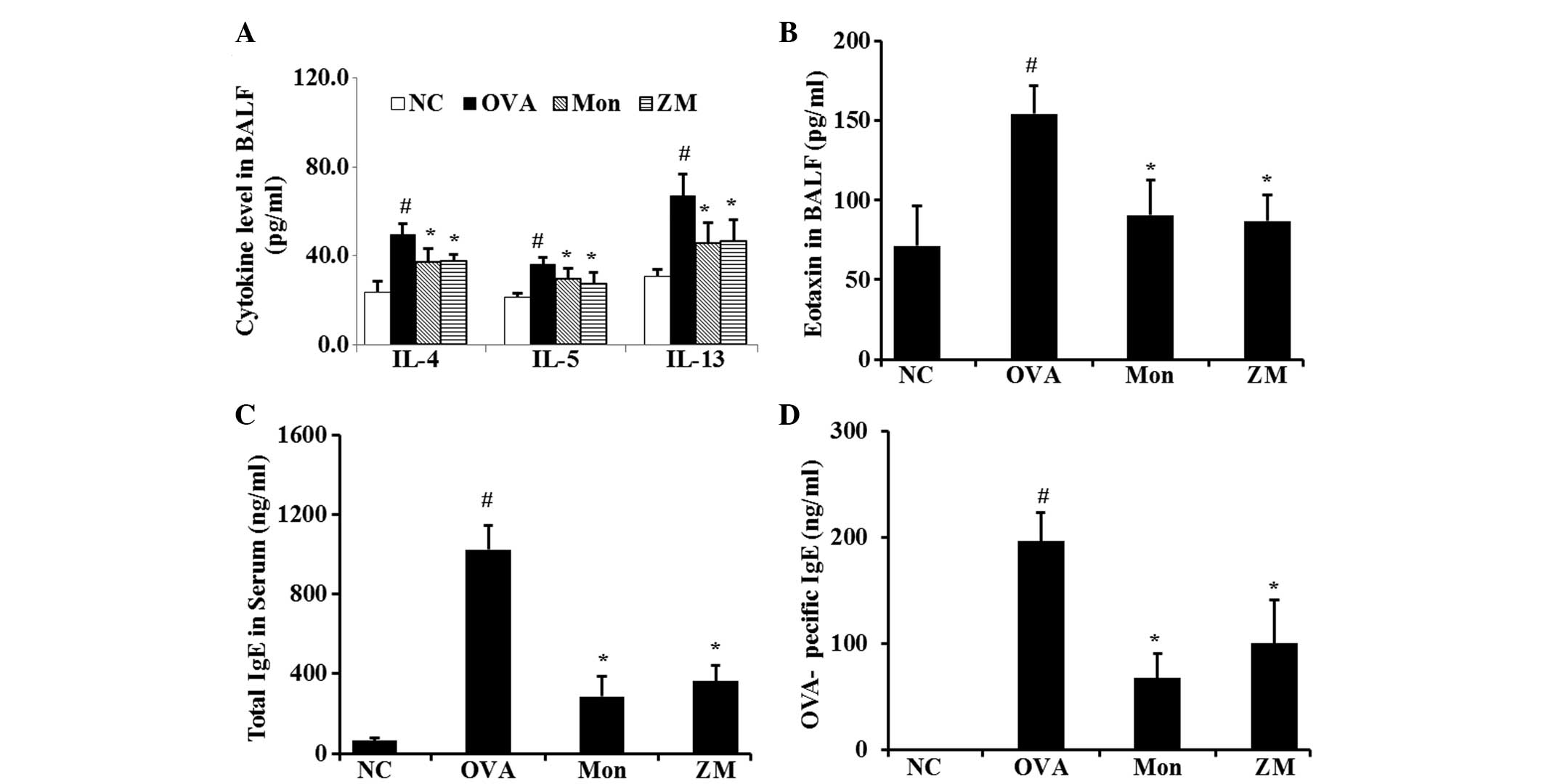 Significantly increased numbers of inflammatory cells, particularly eosinophils, were observed in the BALF samples from OVA-induced mice compared with samples from the normal controls. BALF samples from the ZM-treated mice exhibited a markedly decreased number of inflammatory cells, including eosinophils, macrophages, lymphocytes and neutrophils, compared with samples from the OVA-challenged mice (Fig. 2).