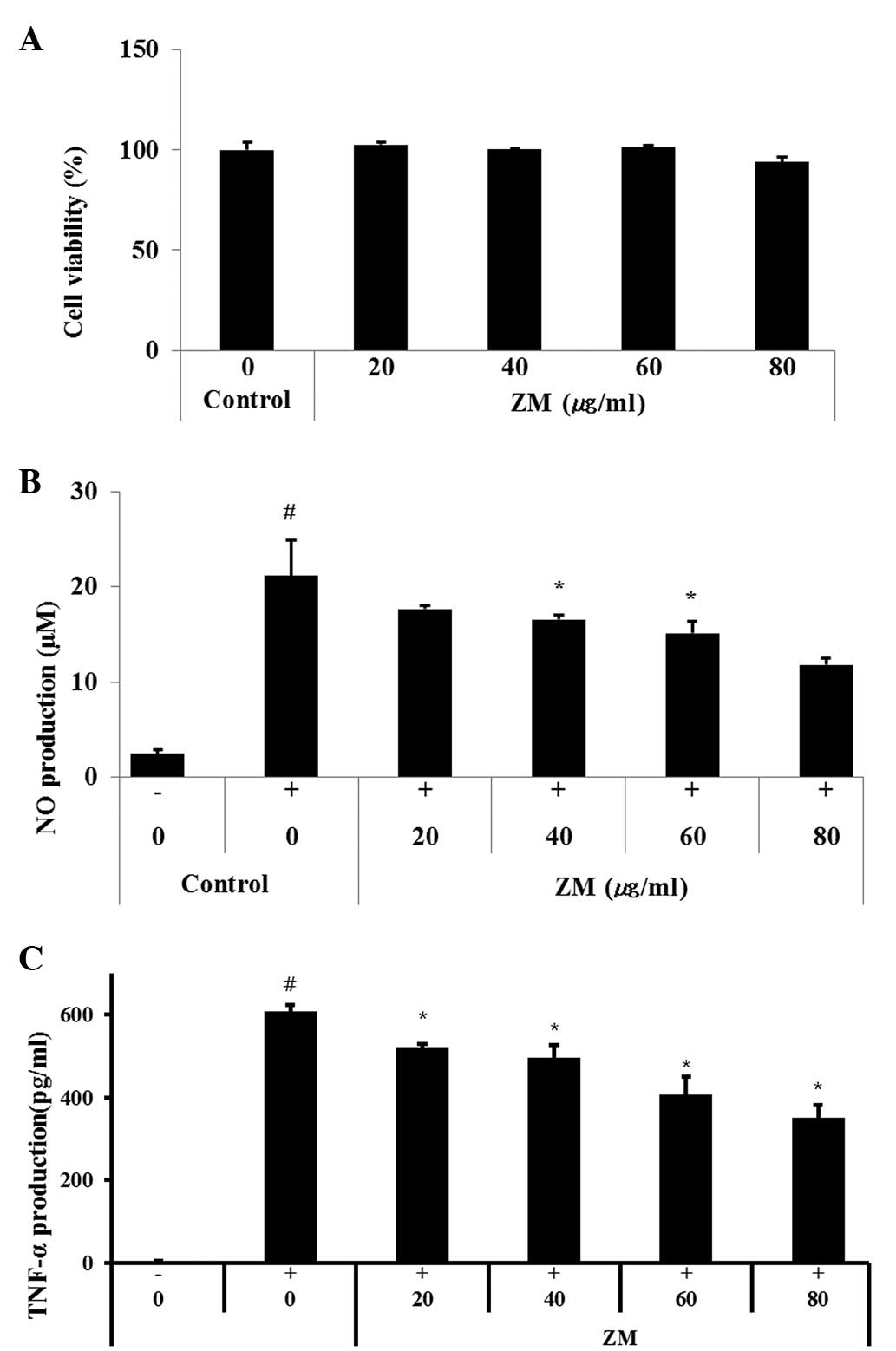 The RAW264.7 murine macrophage cells (American Type Tissue Collection, Manassas, VA, USA) were maintained in Dulbecco's modified Eagle's medium (DMEM; Gibco Life Technologies, Grand Island, NY, USA), supplemented with 10% heat-inactivated fetal bovine serum (FBS; Gibco Life Technologies) and antibiotics (100 U/ml penicillin, 100 µg/ml streptomycin, Gibco Life Technologies) at 37°C in an incubator containing 5% CO2 and 95% air. The cell viability of cells treated with ZM was measured using a 3-(4,5-dimethylthiazol-2-yl)-2,5-di-phenyltetrazolium bromide (MTT; Amresco, LLC, Solon, OH, USA) assay. The RAW264.7 cells were cultured in 96-well plates at a density of 1×104 cells/well. The ZM extract was obtained from The Plant Extract Bank at the Korea Research Institute of Bioscience and Biotechnology (PB2176.2; Chungbuk, Korea). The ZM extract was added to each individual well at a concentration of 20, 40, 80 and 100 µg/ml, and then incubated for 24 h. The control cells were treated with an equivalent volume of phosphate-buffered saline (PBS; pH 7.4). MTT solution (10 µl) was added to each well, and the plates were incubated for 4 h at 37°C. After 4 h, 100 µl dimethyl sulfoxide (Samchun Pure Chemical Co., Ltd., Daejeon, Korea) was added to each well to solubilize the formazan crystals. The optical density was measured at 570 nm using a microplate reader (VersaMax; Molecular Devices, Sunnyvale, CA, USA).