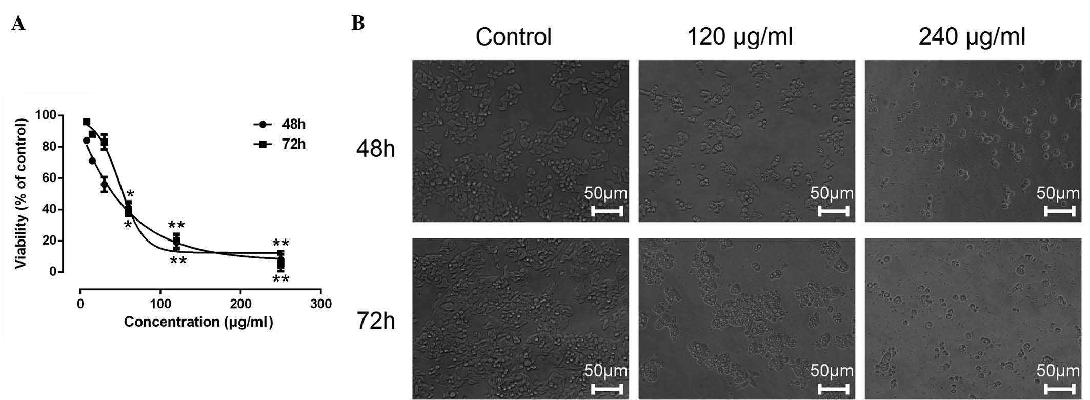 The effect of ESMC2 on MDA-MB-231 cell proliferation was evaluated by an MTT assay. Exponentially growing cells were seeded into 96-well plates at a density of 2×104 cells per well in medium. After 24 h of incubation at 37°C, cells were treated with ESMC2 at various concentrations (8, 15, 30, 60, 120 or 250 µg/ml) for 48 h. Subsequently, 20 µl MTT (5 mg/ml) was added to each well and cells were incubated at 37°C for 4 h. After removal of the medium, 150 µl DMSO was added to each well, and the optical density of the cells was determined with a microplate reader (model 550; Bio-Rad Laboratories, Hercules, CA, USA) at 490 nm. The cell viability was expressed in absorbance units (24).