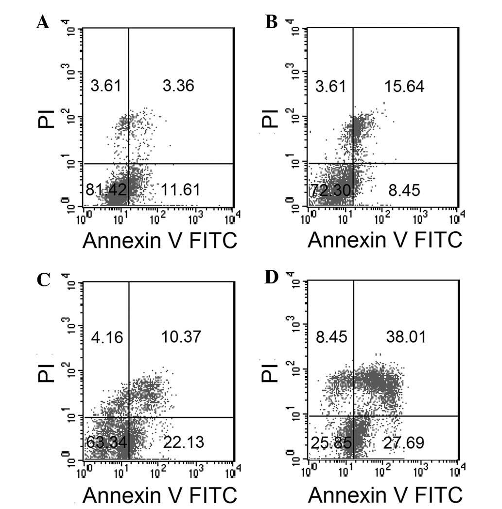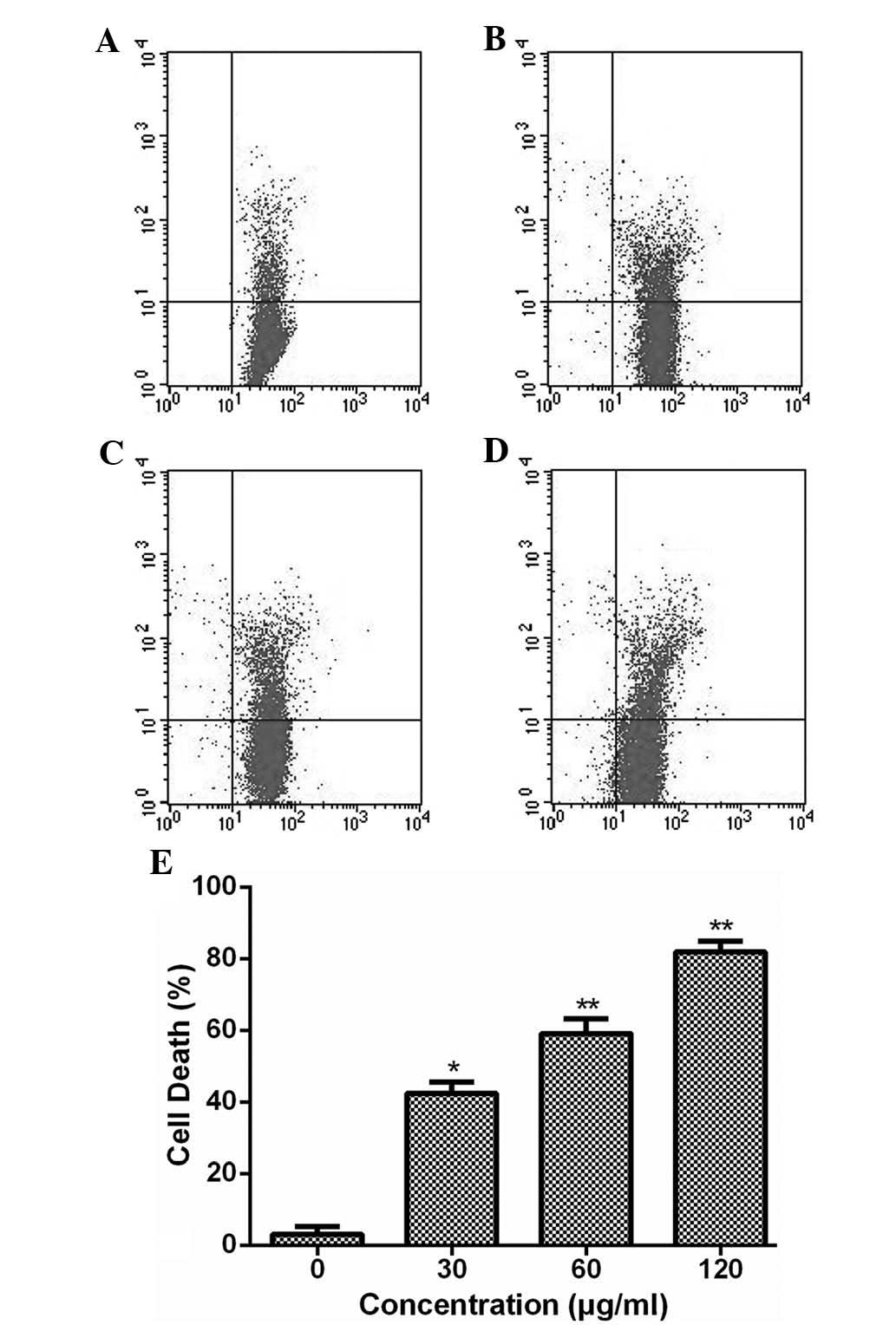 To confirm the effect of ESMC2 on cell apoptosis and to distinguish between apoptosis and necrosis, treated cells were stained with Annexin V-FITC and PI and analyzed by flow cytometry. A dose-dependent increase in the percentage of apoptotic cells (Annexin V-positive, PI-positive) was observed. The percentage of apoptotic MDA-MB-231 cells resulting from treatment with 0, 30, 60 and 120 µg/ml ESMC2 was 14.97, 24.09, 32.50 and 65.70%, respectively. In parallel with this, the rate of early apoptosis and necrosis, shown in the lower right and upper left quadrants, respectively, increased in a dose-dependent manner (Fig. 5).