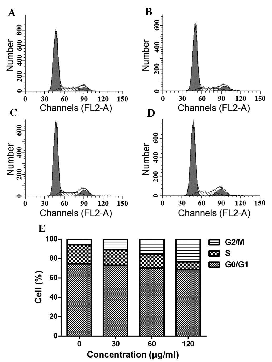 To gain further insight into the underlying mechanisms of the cytotoxic effects of ESMC on MDA-MB-231 cells, the present study next investigated the effect of the preparation on cell cycle progression. Cells treated with 30, 60 and 120 µg/ml ESMC2 for 48 h displayed a G2-phase arrest. As shown in Fig. 3, the percentage of cells accumulated in G2 phase was 5.66, 10.67, 15.63 and 23.20% following treatment with 0, 30, 60 and 120 µg/ml ESMC2, respectively. The accumulation of cells in S phase was maximal in the control group and declined following treatment with ESMC2 in a dose-dependent manner. The S-phase population was 19.71, 16.11, 14.17 and 7.97% following treatment with 0, 30, 60 and 120 µg/ml ESMC2 for 48 h, and these decreases were associated with a concomitant increase in apoptosis and accumulation of cells in G2 phase. This indicated that the ESMC2-mediated death of MDA-MB-231 cells may have been initiated, at least in part, by the induction of G2-phase arrest.