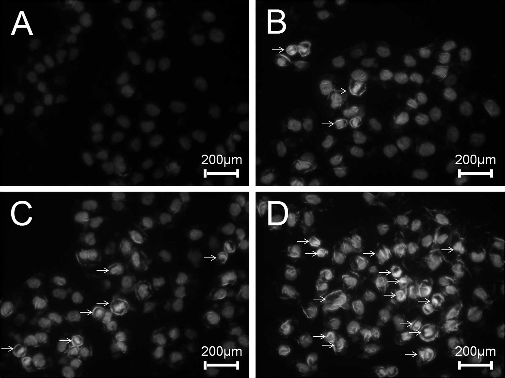 To investigate the effects of ESMC2 on the induction of apoptosis, MDA-MB-231 cells were treated with ESMC2, followed by assessment of DNA fragmentation, an important characteristic of apoptosis, which can be easily distinguished by Hoechst staining. In accordance with the abovementioned results, treatment with 30, 60 and 120 µg/ml of ESMC2 for 48 h led to a significant nuclear condensation or nuclear fragmentation (Fig. 4).