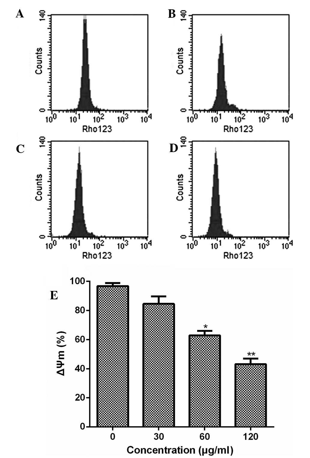 Furthermore, the present study examined the effect of ESMC2 treatment on the mitochondrial transmembrane potential using rhodamine 123 staining followed by flow cytometric analysis. Treatment of MDA-MB-231 cells with ESMC2 caused a decrease in rhodamine 123 fluorescence intensity from 96.42% in untreated cells to 84.13, 62.98 and 43.30% in cells treated with 30, 60 and 120 µg/ml of ESMC2, respectively (Fig. 6). This loss of the mitochondrial membrane potential further demonstrated that ESMC2 caused apoptosis in breast cancer cells.