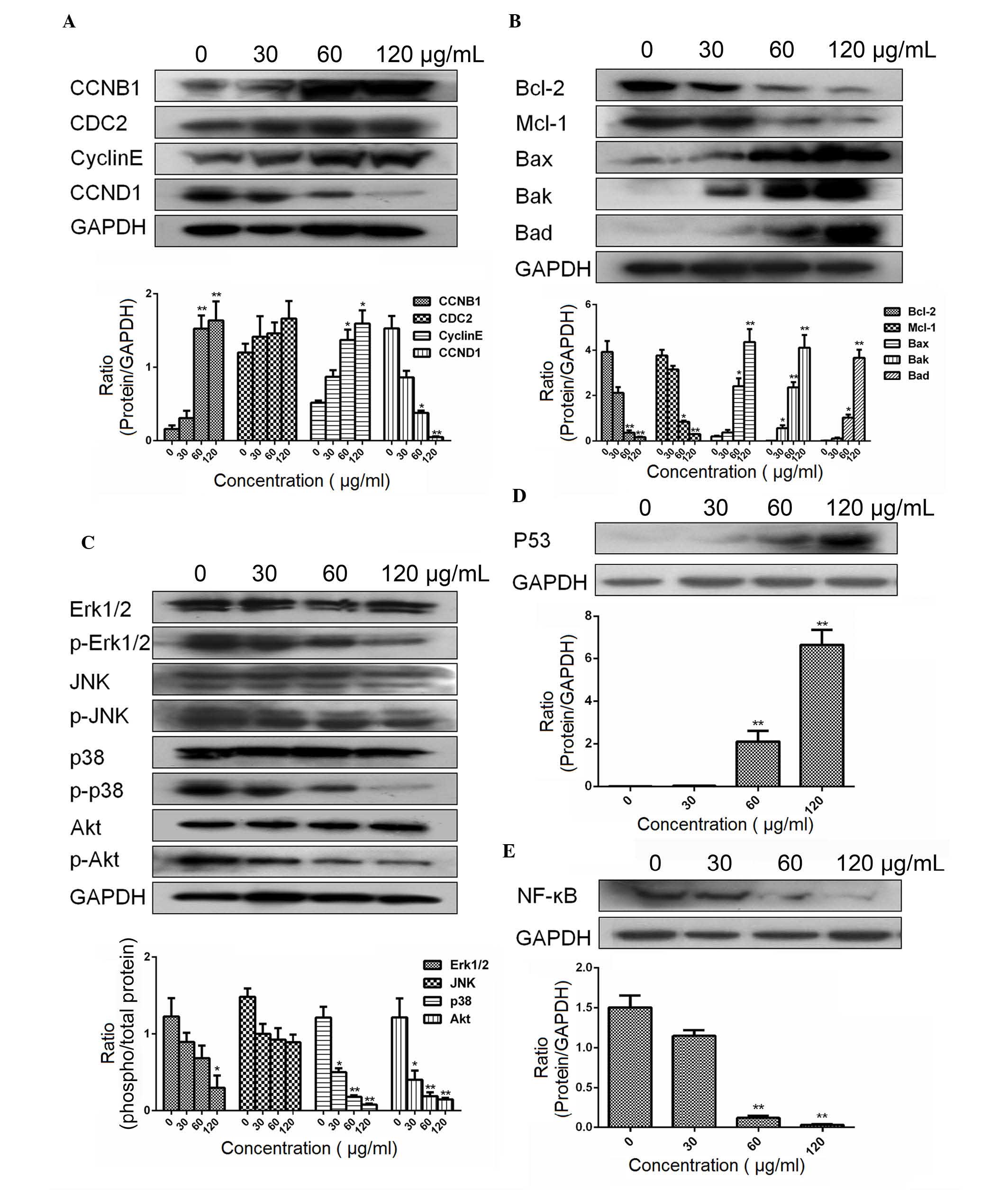 Multiple signal transduction pathways are involved in the regulation of cell cycle progression and the induction of apoptosis. The results of the present study showed that ESMC2 was able to induce G2-phase arrest; therefore, its effect on the expression of cell cycle-regulating proteins was assessed. MDA-MB-231 cells treated with ESMC2 (30, 60 and 120 µg/ml) for 48 h were subjected to western blot analysis. Treatment with ESMC2 led to a significant increase in CDC2, Cyclin B1 and cyclin E expression, and a subsequent decrease in Cyclin D1 expression in a dose-dependent manner (Fig. 7A). Next, the expression of Bcl-2 family proteins in MDA-MB-231 cells treated with increasing concentrations of ESMC2 (30, 60 and 120 µg/ml) for 48 h was examined by western blot analysis. Treatment with ESMC2 led to a marked decrease in Bcl-2 and Mcl-1 expression and a significant upregulation of Bax, Bak and Bad expression (Fig. 7B). To further explore the underlying mechanisms of ESMC2-induced apoptosis, the effect of ESMC2 on the MAPK pathway was assessed by determining the levels of total as well as phosphorylated Erk1/2, JNK, P38 and Akt. According to western blot analysis, treatment with ESMC2 led to a significant decrease in the expression of phospho-Erk1/2, phospho-JNK, phospho-P38 and phospho-Akt, while total protein levels remained constant (Fig. 7C). The results suggested that the protein phosphorylation, and thereby their activation, was downregulated by ESMC2 in a dose-dependent manner. Further western blot experiments showed that ESMC2 was able to upregulate p53 (Fig. 7D) and downregulate NF-κB (Fig. 7E) expression.