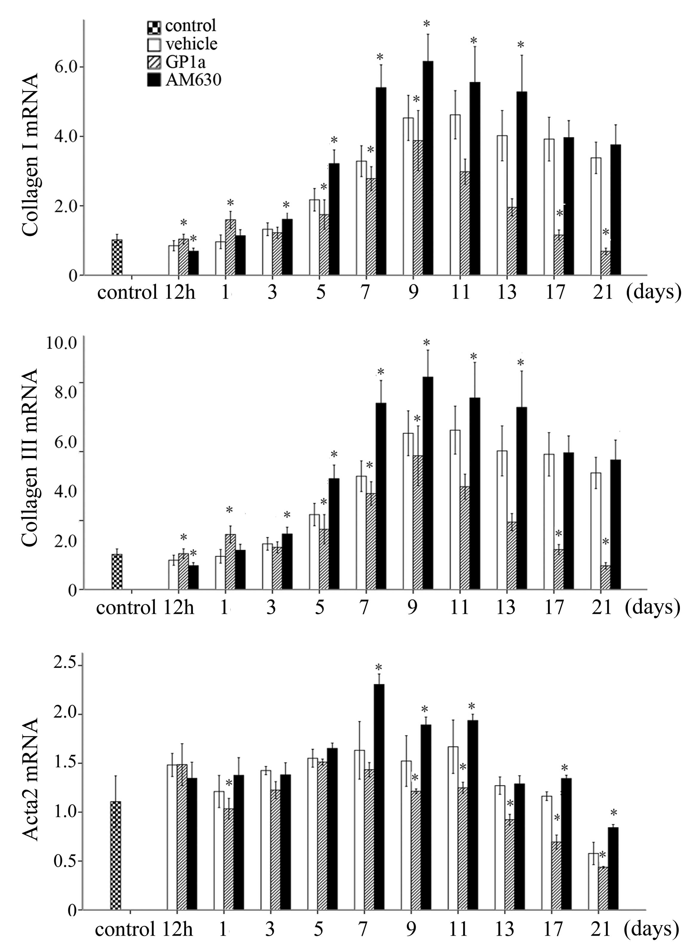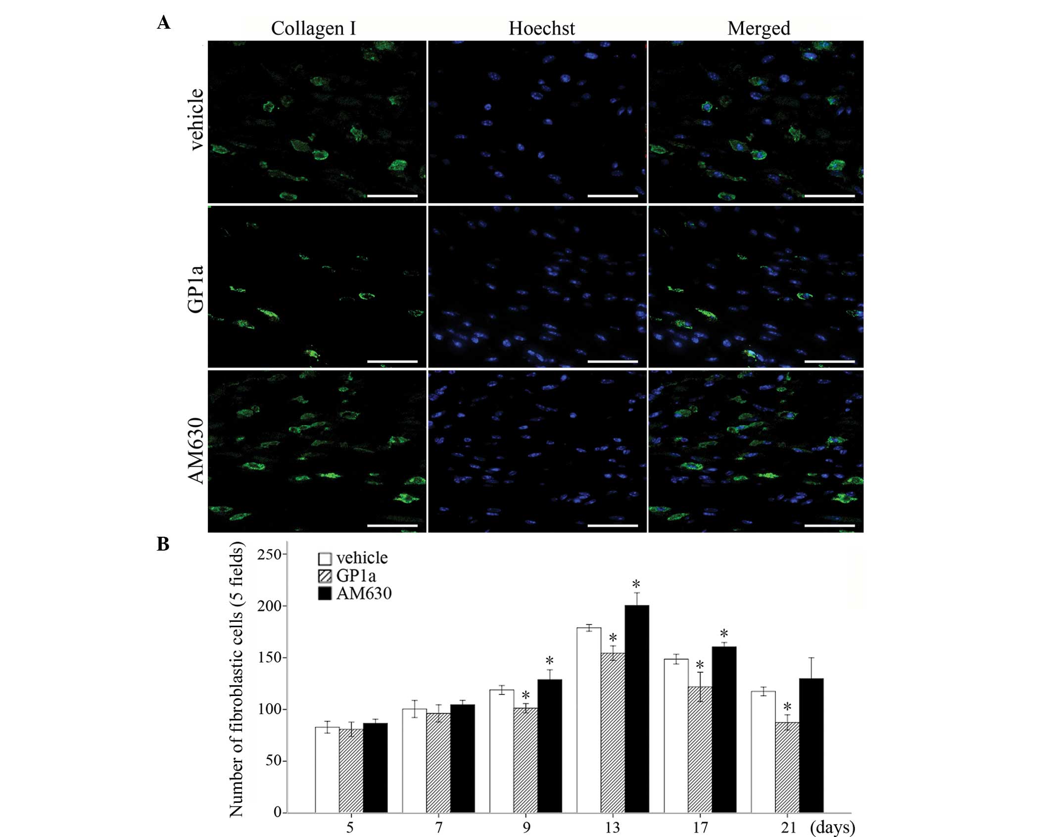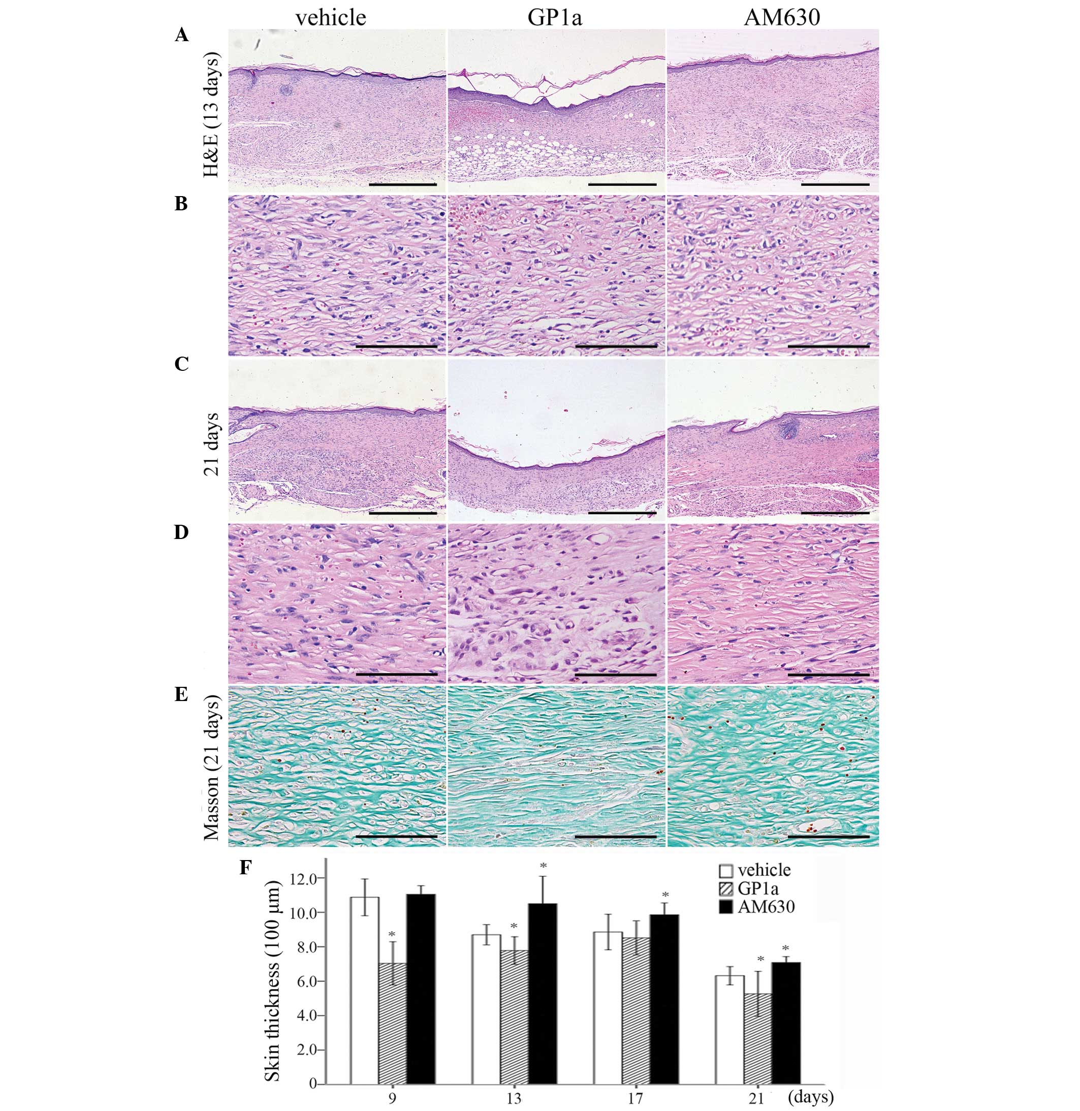 HE staining revealed that, in the vehicle-treated group, numerous polymorphonuclear cells were detected microscopically at 12 h and 1 day post-injury. Mononuclear cells (MNCs), spindle-shaped FBCs and endothelial cells appeared in the wounded zone at 3 days post-injury. Fibrotic tissue formation was observed at 5 days, and became more evident between 9 and 21 days post-injury. The results of the HE and Masson's trichrome staining revealed that the GP1a-treated mice exhibited less collagen deposition and slender fibers, compared with the vehicle-treated mice. By contrast, the mice treated with AM630 exhibited increased collagen deposition and thicker fibers between days 9 and 21 post-injury (Fig. 1A–E).