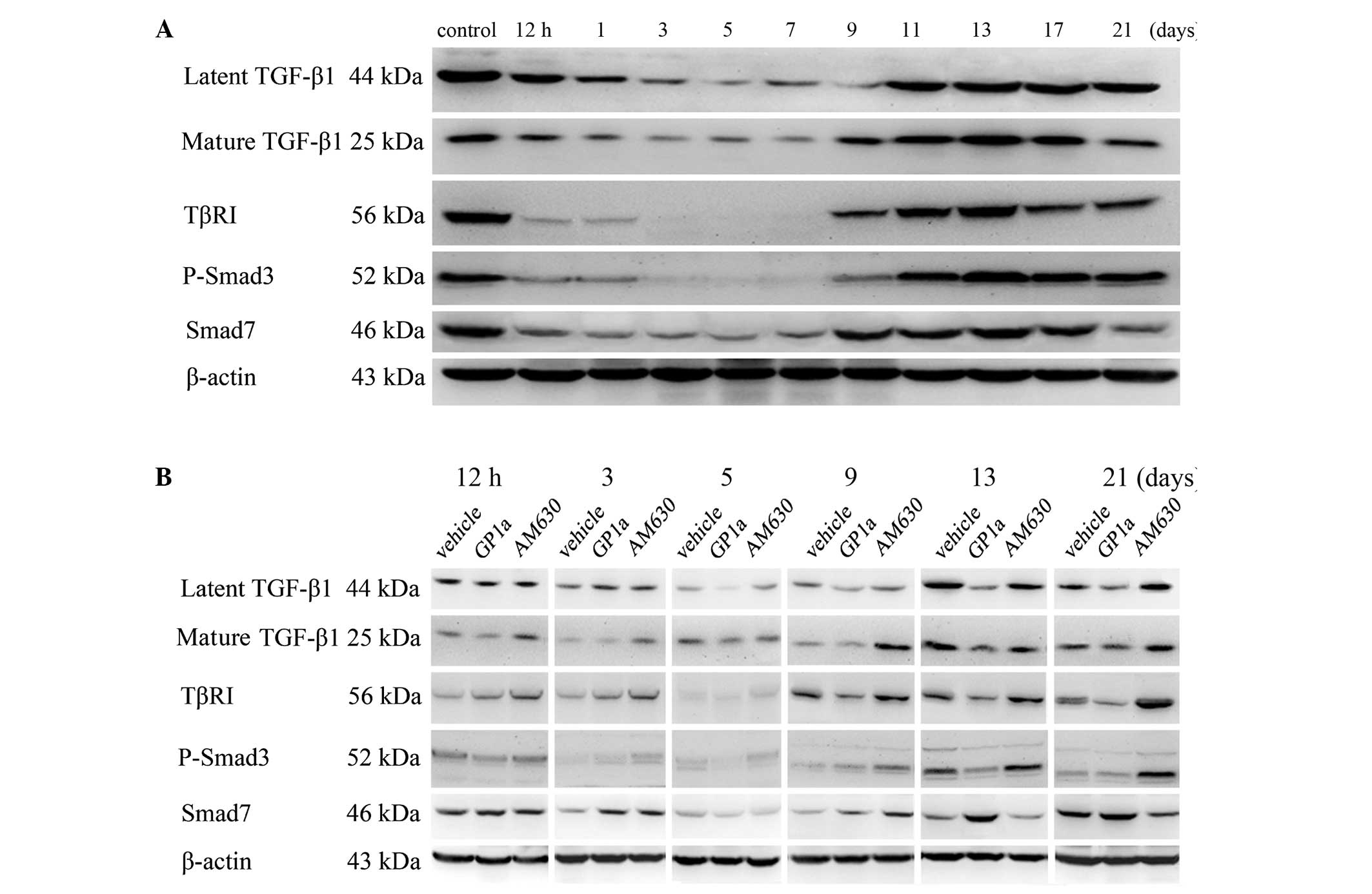 The results of the western blot analysis of TGF-β1, TβRI, P-Smad3, Smad7 and β-actin for the vehicle-treated samples are shown in Fig. 6A. The relative protein expression levels of TGF-β1 (latent and mature), TβRI, P-Smad3 and Smad7 gradually decreased between 12 h and 3 days, were decreased at 5 days post-injury, gradually increased from day 7 and peaked at day 13, prior to decreasing moderately (Fig. 7). The bands of TGF-β1, TβRI, P-Smad3 and Smad7 proteins in the GP1a- and AM630-treated groups are shown in Fig. 6B. Between 12 h and 7 days post-injury, there was a marked upregulation of latent TGF-β1 in the AM630-treated group, however, minimal change was observed in the GP1a group, compared with the vehicle group. From 9 days onwards, the expression of latent TGF-β1 in the GP1a-treated group was substantially lower, compared with that in the vehicle group. In mature TGF-β1, TβRI and P-Smad3, no significant differences were observed among the GP1a, AM630 and vehicle groups between 12 h and 7 days. Between days 9 and 21, the expression levels of mature TGF-β1, TβRI and P-Smad3 in the GP1a group were significantly lower, compared with those in the vehicle group, whereas these levels were increased in the AM630 group. However, the results of Smad7 differed. Between 12 h and 5 days post-injury, no significant differences were observed among the three groups. Between days 7 and 21 days, Smad7 was markedly increased in the GP1a-treated group, however, minimal change was observed in the AM630-treated group, compared with the vehicle group (Fig. 7; P<0.05).