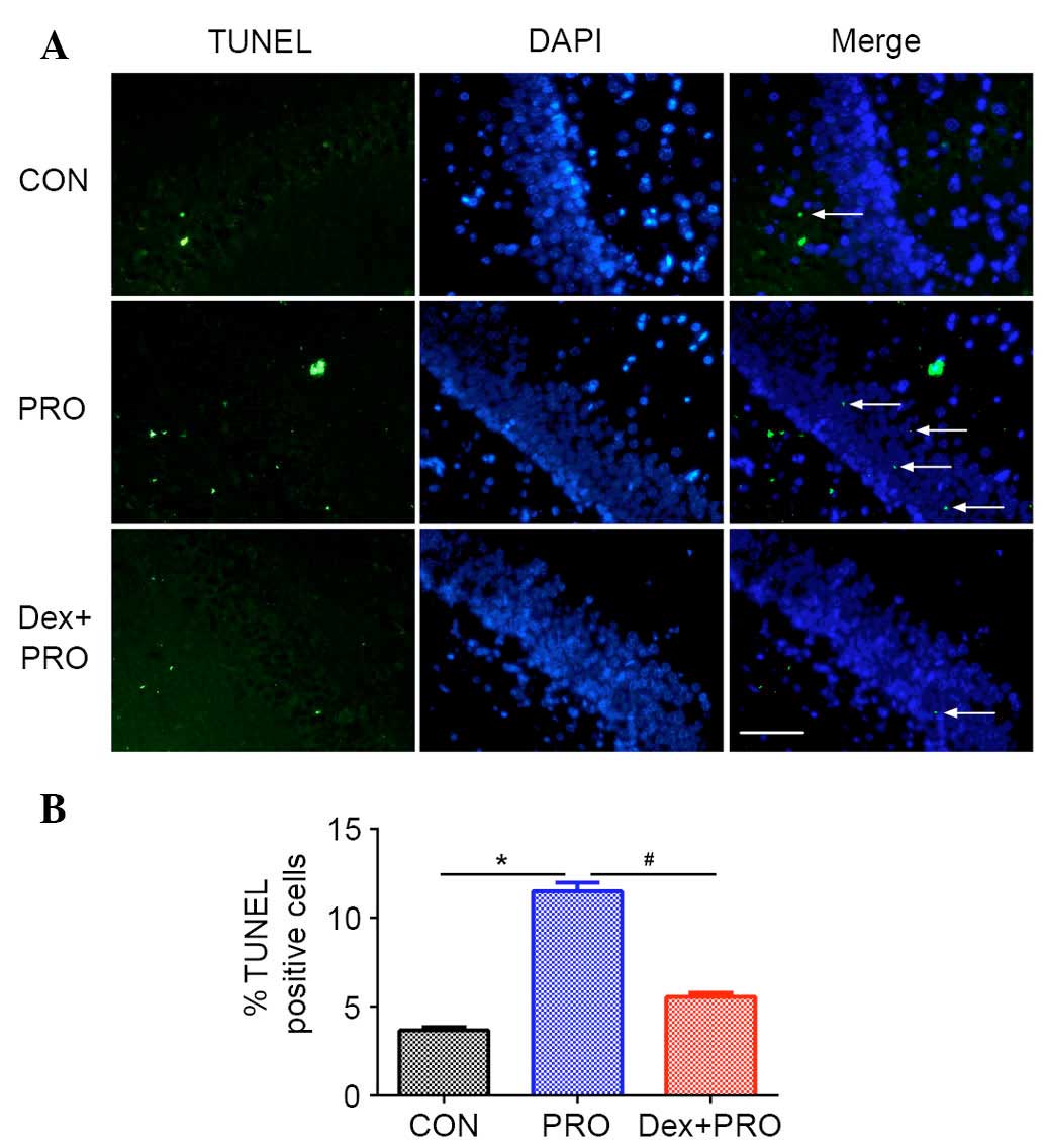 The number of TUNEL-positive cells per mm2 in the hippocampal CA1 region was higher in the propofol-treated animals compared with control animals (P=0.0007; Fig. 2). Pretreatment with 75 µg/kg Dex 20 min prior to propofol exposure significantly reduced the number of TUNEL-positive cells in the CA1 region compared with the PRO group (P=0.0005; Fig. 2).