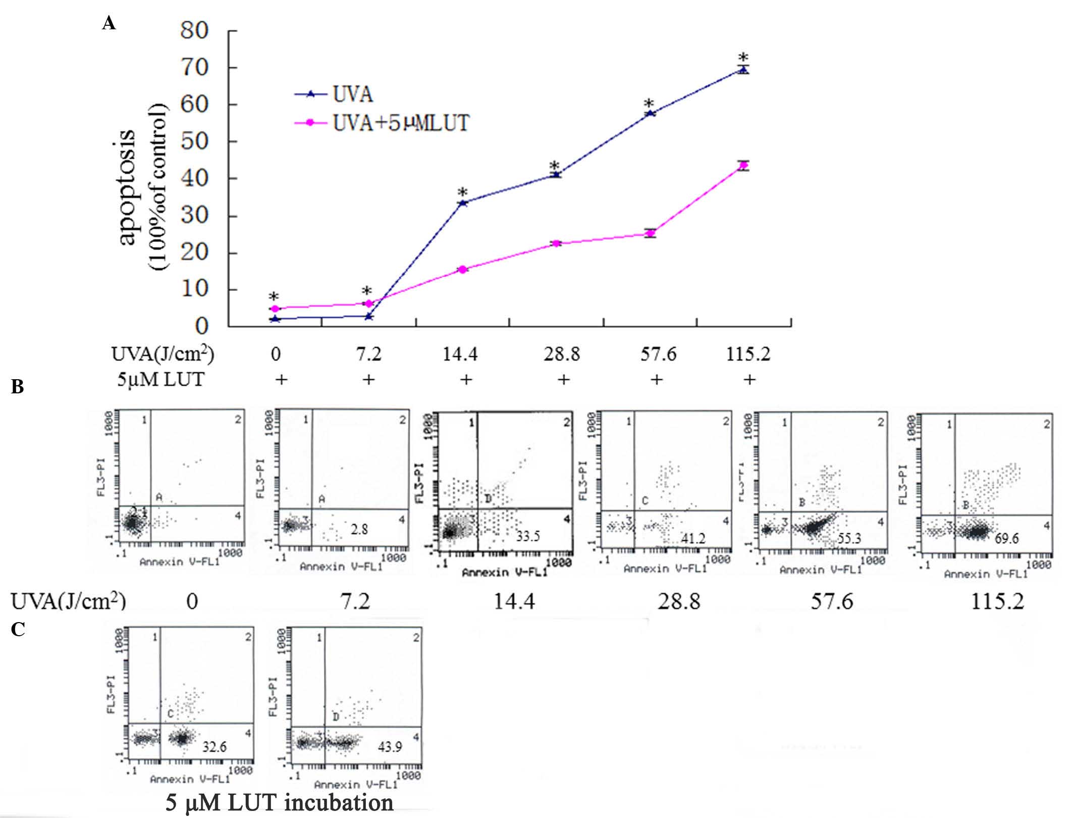 Apoptosis was determined using an Annexin V-fluorescein isothiocyanate (FITC)/propidium iodide (PI) staining procedure. In brief, following treatment with UV irradiation and incubation with LUT, the cells were collected and washed twice with ice-cold PBS, followed by incubation with Annexin V-FITC and PI. Fluorescence was measured using a BD FACSCalibur flow cytometer (BD Biosciences, Franklin Lakes, NJ, USA) with an excitation wavelength of 480 nm through a FL-1 filter (530 nm) and a FL-2 filter (585 nm).