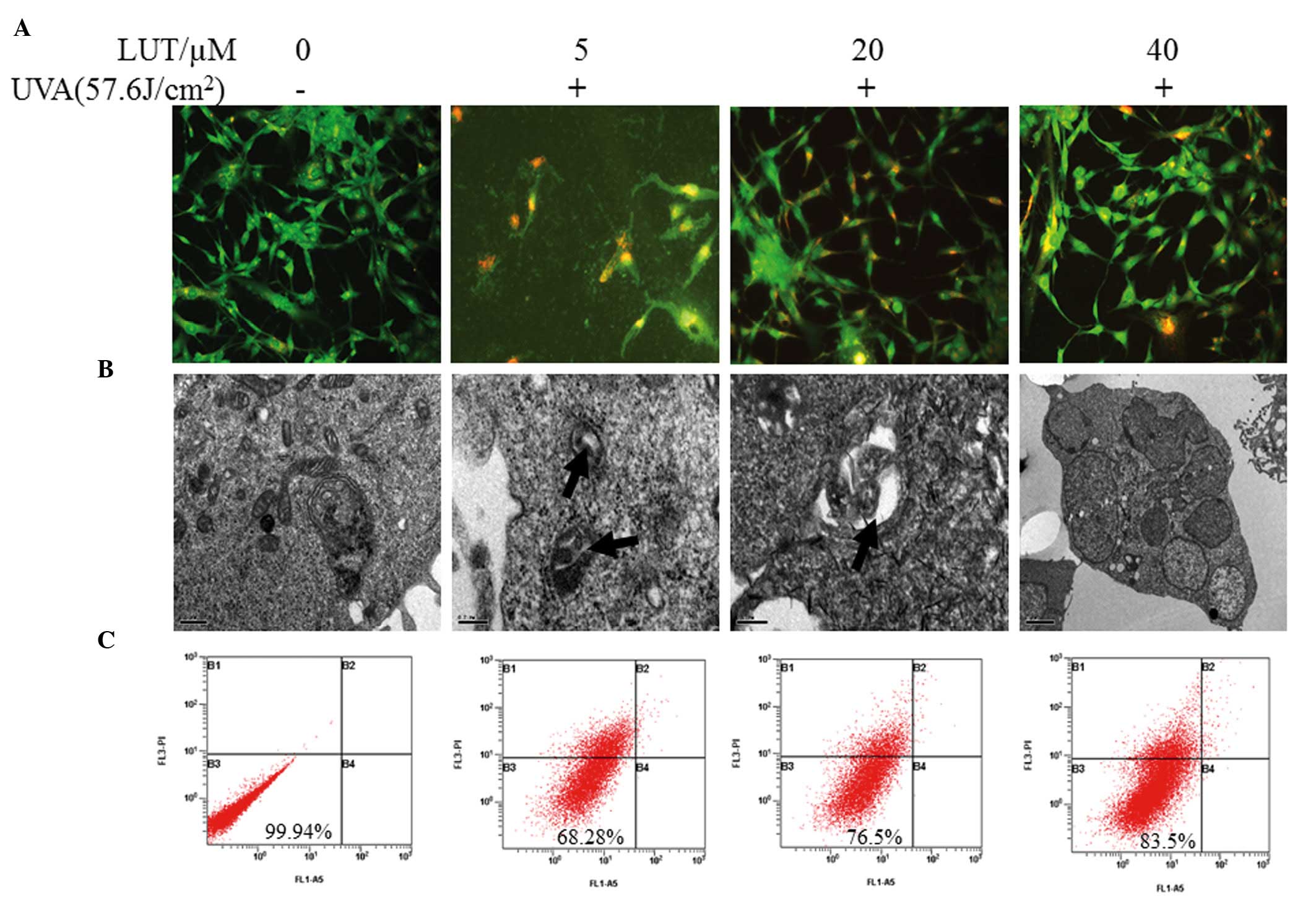 Autophagy, also termed non-apoptotic programmed cell death (type II programmed cell death), involves a series of biochemical steps, through which eukaryotic cell death is induced through self degradation of their own cytoplasm and organelles (17). To determine whether LUT treatment decreases UVA-induced HSF autophagy, the cells were observed under a fluorescence microscope to detect AVO formation following staining with MDC. Punctuation of MDC-positive cells were observed when treated with 5 µM LUT, compared with 40 µM LUT, as shown in Fig. 3A. As shown in Fig. 3B, following treatment with the higher concentration of 40 µM LUT, AVO formation decreased. The formation of AVOs decreased sharply following 24 h of treatment with the combination of LUT. To further demonstrate the induction of autophagy, electron microscopy was performed, which is the Gold Standard method for confirmation of autophagy. It was found that, in all treatments, incubation with higher concentrations of LUT exhibited fewer AVOs (Fig. 3B). Almost no cell death was observed in the untreated cells (Fig. 3C).