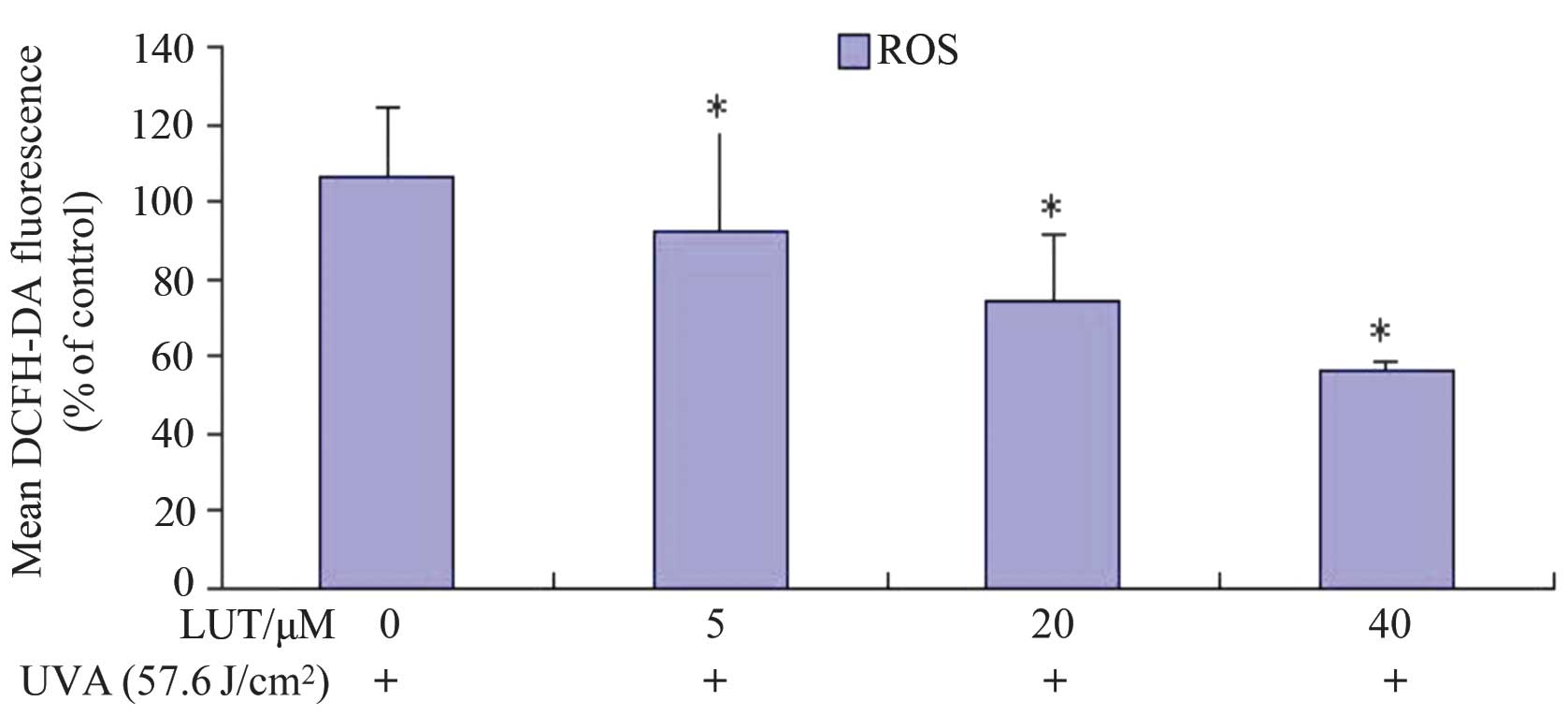 Cell redox status changes between the equilibration of ROS and GSH. In addition, MMP disruption and cell apoptosis are always associated with the generation of intracellular ROS and depletion of GSH (18,19). Therefore, the present study examined the levels of ROS in HSFs treated with UVA irradiation, with and without incubation with LUT. The ROS levels were examined by DCFH-DA. The rapid generation of ROS, which was between 1.89- and 1.30-fold faster, compared with the control, was detected following UVA treatment, as shown in Fig. 4. Incubation with LUT decreased UVA-induced ROS production in the HSFs following treatment with 40 µM LUT, compared with the cells exposed to UVA alone. These results indicated that LUT assisted in impairing the UVA-induced increase in ROS levels in the HSFs.
