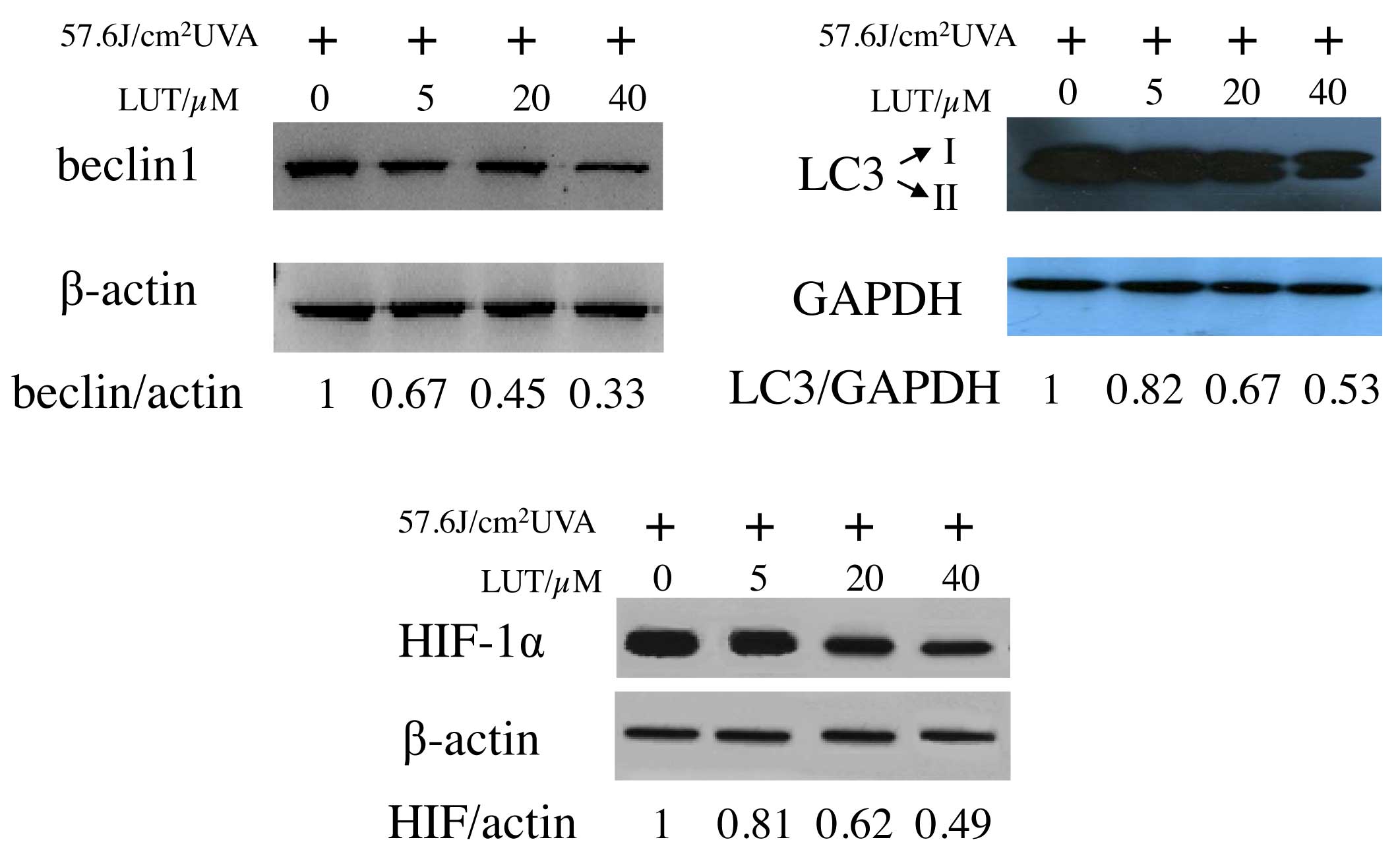 HIF-1α is an important transcriptional factor induced by numerous oxidants. In the present study, HIF-1α was down-regulated in the LUT-treated UVA-irradiated HSFs. It was concluded that there are specific proteins downstream of HIF-1α, which induced autophagy. This indicated the association of HIF-1α with autophagy. Once the expression of HIF-1α decreased, autophagy declines. LUT, acting as a potent ROS scavenger, markedly impaired the production of HIF-1α induced by UVA. These results indicated that LUT decreased the UVA-induced autophagy of the HSFs by scavenging ROS.