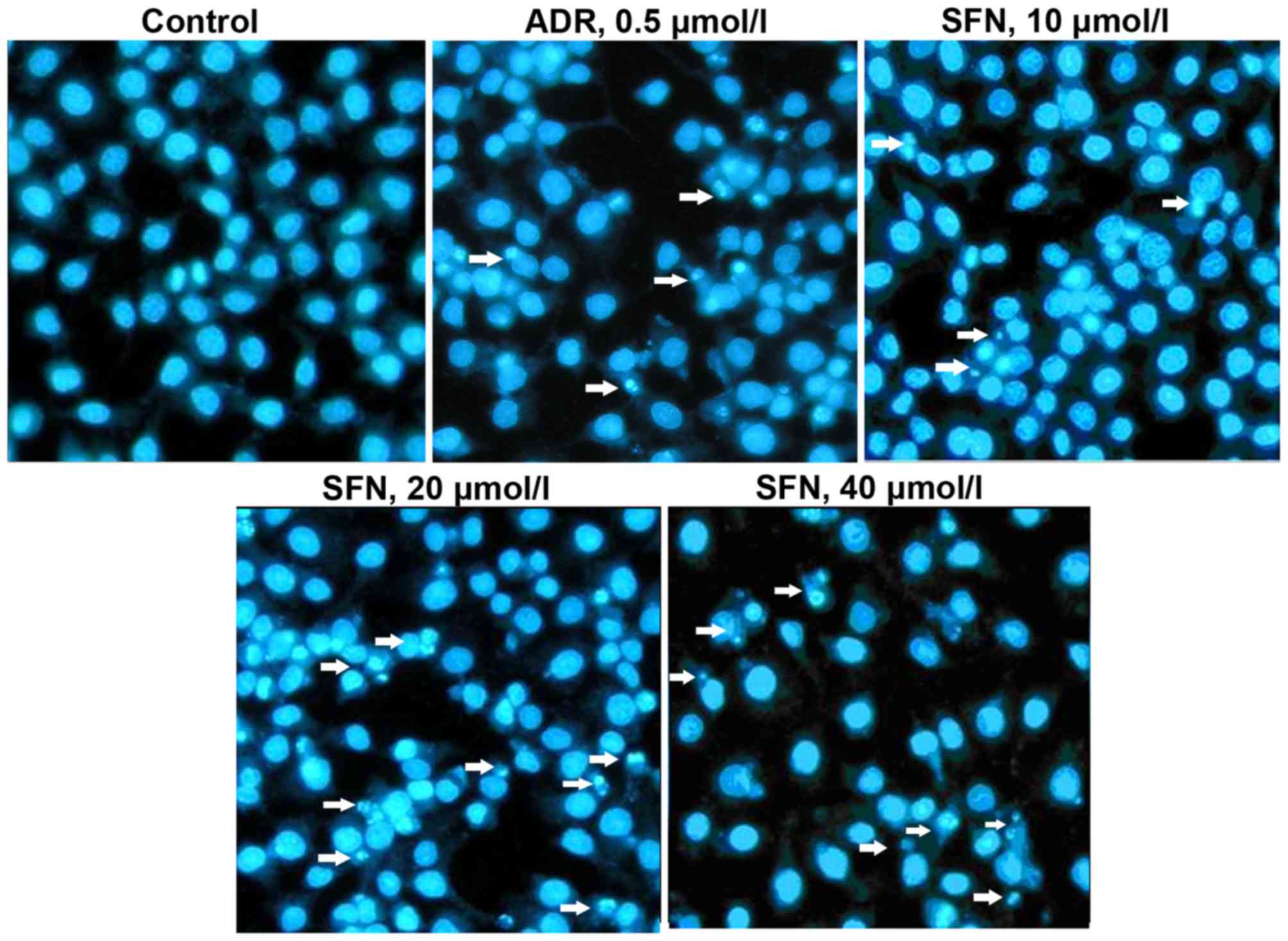 After placing coverslips in a 6-well plate, 3×105 HepG2 cells (1 ml) were seeded in each well and allowed to attach overnight. Cells were cultured with various concentrations of SFN (10, 20 and 40 µmol/l). ADR was added as a positive control at a final concentration of 0.5 µmol/l, and the control group was supplemented with equal volumes of RPMI-1640 culture medium. Following 48 h of treatment with SFN or ADR at 37°C, the cells were digested with pancreatin and washed once with phosphate-buffered saline (PBS). The cells were then fixed with a fixing solution composed of methyl alcohol and glacial acetic acid (3:1) for 10 min at 4°C. After further washing with PBS, 5 mg/l Hoechst 33258 fluorescent probe was added to the cells and incubated for 15 min. The cover slips were hand washed with PBS and placed on glass slides containing drops of glycerin. Finally, the cells were visualized and images were captured under an inverted fluorescence microscope.