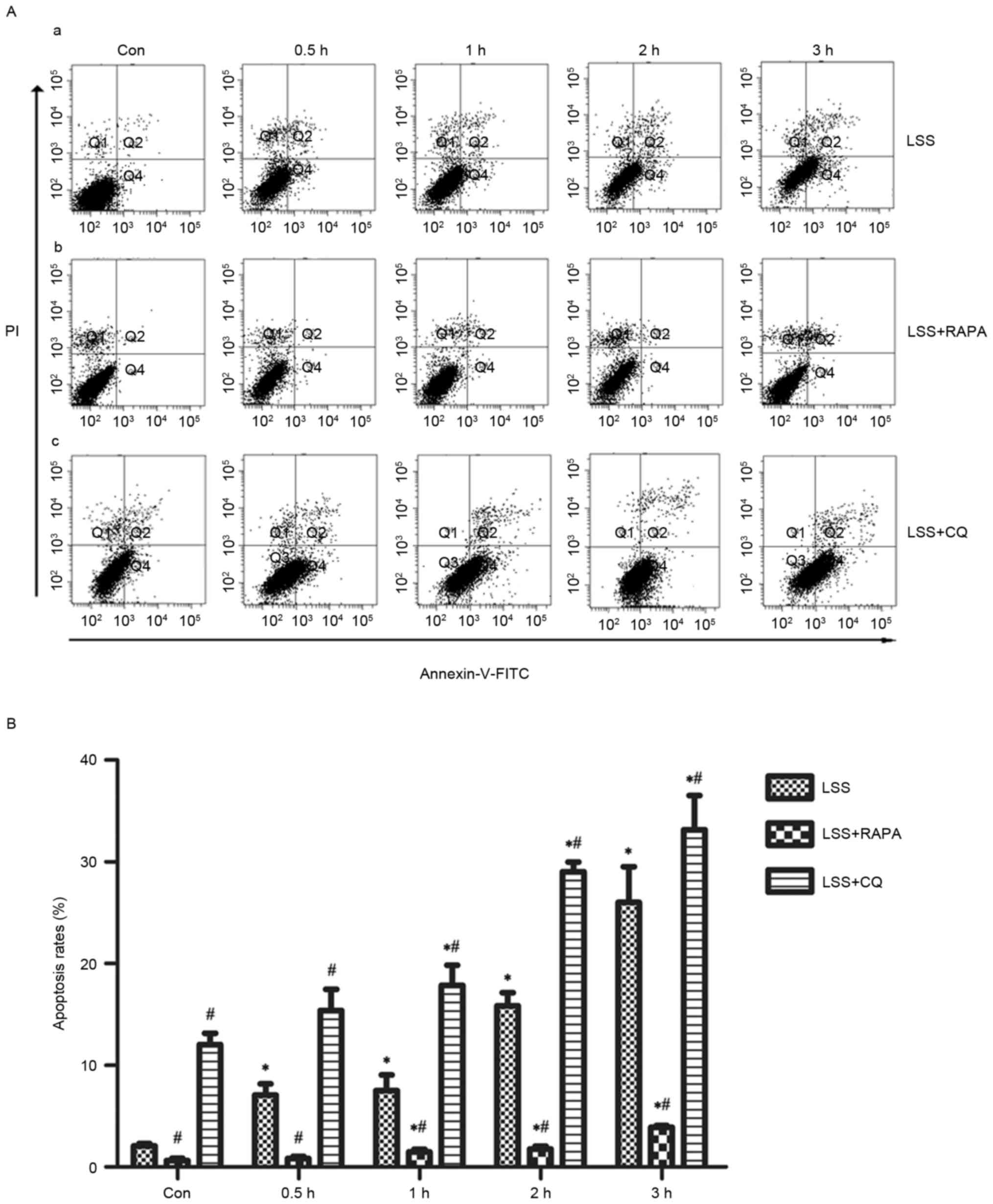 Although the upregulation of autophagy has been observed in HUVECs treated with LSS in the present study, it is unclear whether the autophagy is protective or detrimental. The cross talk between the autophagic and apoptotic cell death pathways is complex (26). The theory that autophagy is initiated as a protective response has become accepted (27). To investigate the effect of autophagy on the LSS-induced apoptosis in HUVECs, rapamycin, a mammalian target of rapamycin (mTOR) inhibitor, was used to induce autophagy. The results demonstrated that rapamycin upregulated the level of autophagy and downregulated the apoptosis rate. Similarly, previous studies demonstrated that rapamycin was able to reduce tert-butyl hydroperoxide-induced apoptosis (28) and mechanical stress-induced endothelial apoptosis (29). Furthermore, rapamycin upregulated the level of Bcl-2, but failed to inhibit the expression of Beclin-1. This may be due to the fact that inhibition of mTOR promotes Beclin-1 expression and prevents the decreasing of Beclin-1 (30). To further investigate the association between autophagy and apoptosis induced by LSS, CQ was used to inhibit autophagy and investigate changes in apoptotic cell death. In the present study, with the decreased level of autophagy induced in CQ, the rate of apoptosis in the HUVECs treated with LSS increased significantly. These results are consistent with the data demonstrating that an increased level of autophagy protects HUVECs from LSS-induced apoptosis, whereas a deceased level of autophagy led to increased apoptosis in HUVECs, which suggests that LSS-induced apoptosis is regulated by autophagy. Autophagy serves a protective role in LSS-induced apoptosis.