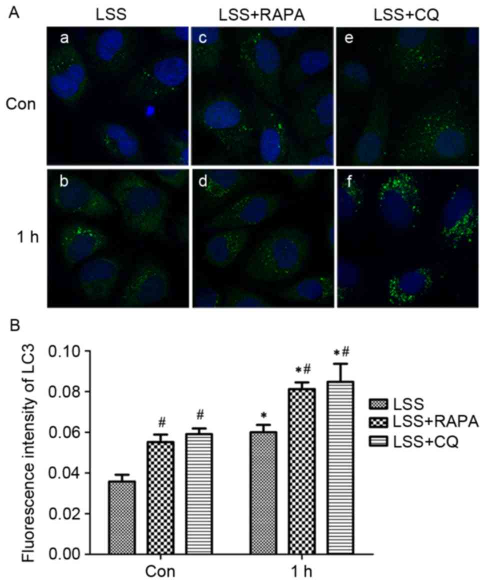 In addition, the treatment with LSS induced extensive formation of LC3 puncta compared with static cells, as determined by LC3 immunofluorescence staining (Fig. 5A-a, -b and B). Pretreatment with rapamycin significantly increased the formation of the LC3 puncta in HUVECs (Fig. 5A-c, -d and B) compared with control and LSS-only group. Pretreatment with CQ resulted in a significant accumulation of LC3 puncta (Fig. 5A-e, -f and B) in HUVECs compared with control and LSS group.