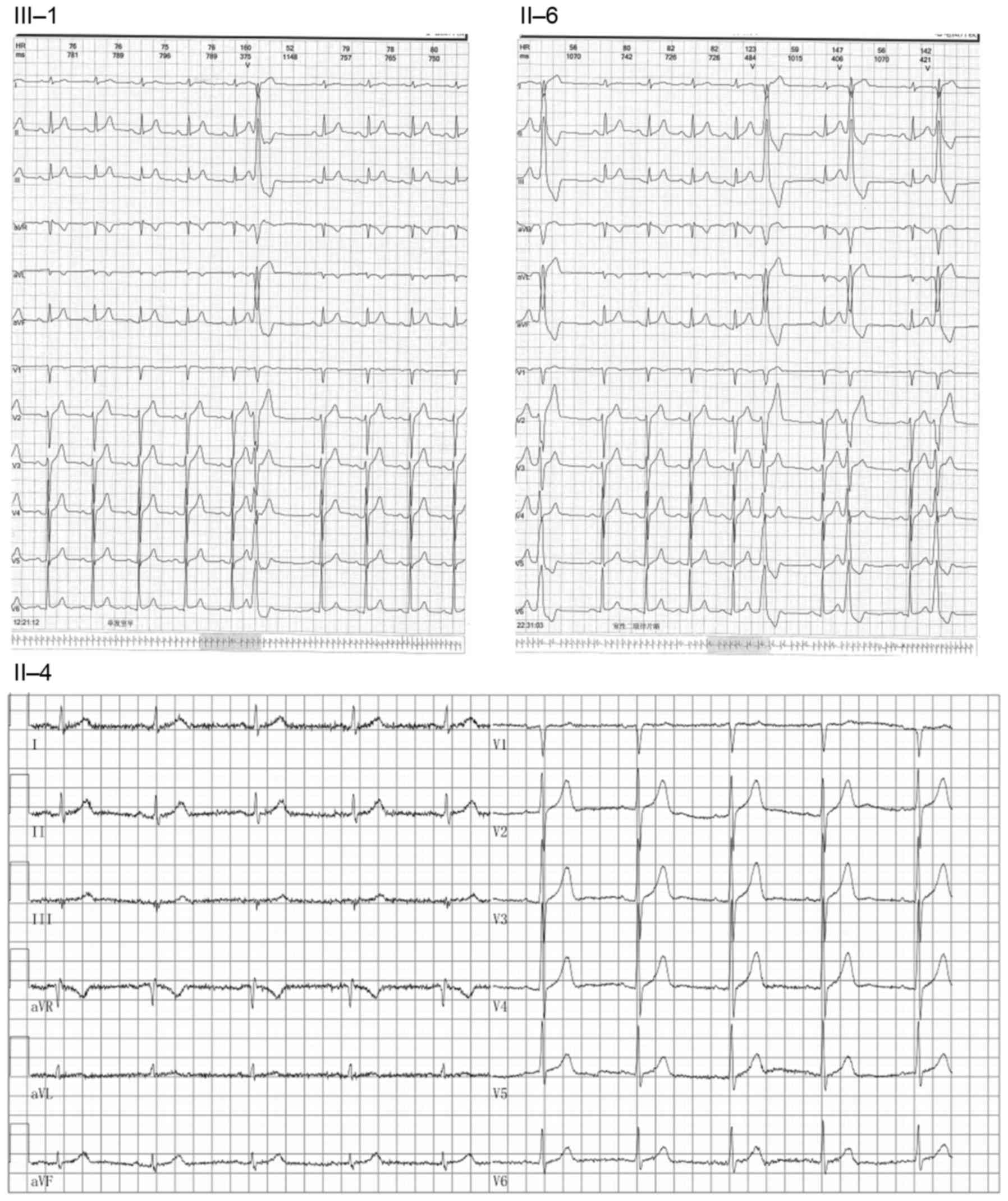 The protocol of the present study was approved by the Review Board of the Second Xiangya Hospital of Central South University (Changsha, China) and the study participants gave informed consent. A total of 14 members of the family (5 affected, 7 unaffected and 2 unknown) were enrolled in the present study. Blood was obtained from the affected probands and family members. Subjects underwent medical tests, including 12-lead electrocardiogram (ECG; Fig. 1) and ultrasonic cardiogram (UCG), and their hospital records were analyzed. A further 200 healthy people were also enrolled to exclude the single nucleotide polymorphism (13).