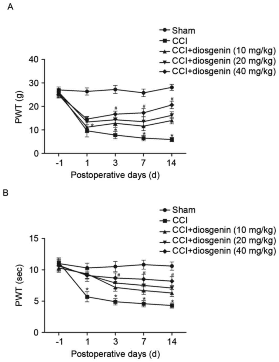 The effects of diosgenin on mechanical allodynia and thermal hyperalgesia were examined. CCI resulted in significant development of mechanical allodynia (Fig. 1A) and thermal hyperalgesia (Fig. 1B), as compared with the sham group as assessed on day 1, 7 and 14. However, diosgenin treatment reversed CCI-induced mechanical allodynia and thermal hyperalgesia in a dose-dependent manner.