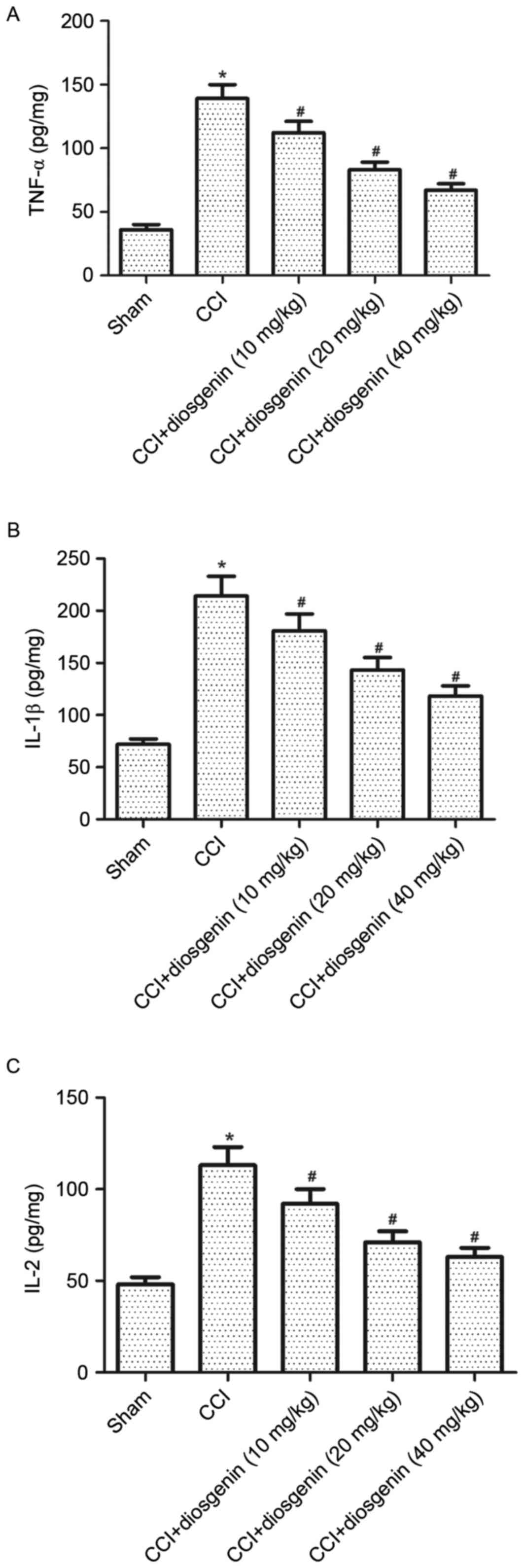 Increasing evidence suggests that peripheral nerve injury contributes to neuropathic pain via upregulation of pro-inflammatory cytokines (19–21). TNF-α is a predominant pro-inflammatory cytokine contributing to pain hypersensitivity following nerve damage; intrathecal injection of a TNF-α inhibitor prior to nerve injury reduces neuropathology and pain-associated behaviors (22). In addition, IL-1β levels increase significantly in the sciatic nerve following CCI (23). Consistent with previous studies, the present study demonstrated that the levels of TNF-α, IL-1β and IL-2 were significantly increased in the spinal cord of CCI rats, compared sham-operated rats. However, diosgenin treatment reversed this effect in a dose-dependent manner. These results suggested that the beneficial effects of diosgenin in CCI-induced neuropathic pain are mediated via its attenuating effect on pro-inflammatory mediators.