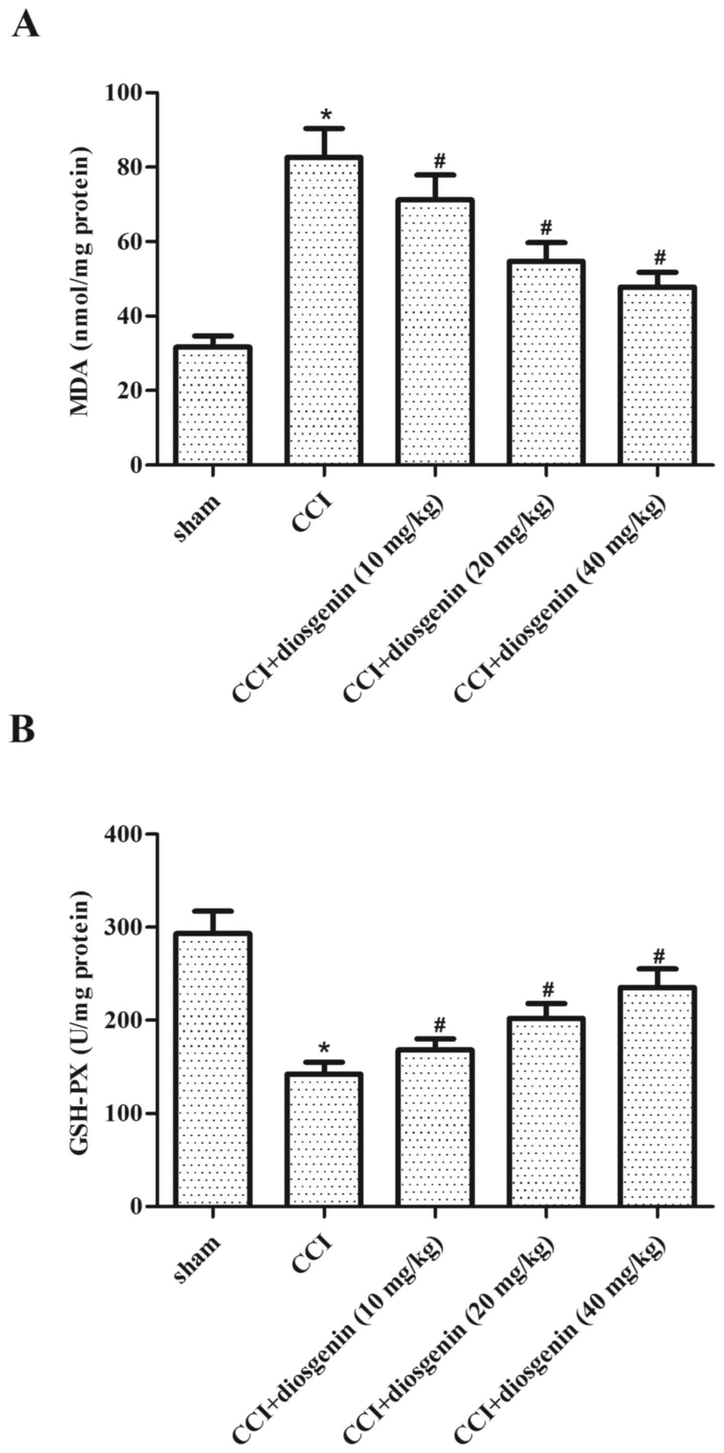 The effects of diosgenin on oxidative stress in spinal cord were examined by ELISA. Rats in the CCI group exhibited a significant increase in the production of MDA (Fig. 3A) and decrease in the content of GSH-PX (Fig. 3B), compared with the sham group. Diosgenin treatment obviously reversed CCI-induced oxidative stress in spinal cord in a dose-dependent manner.