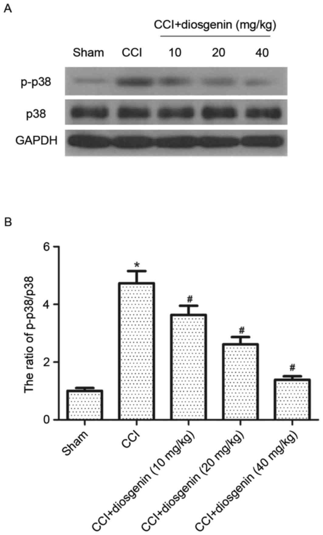 It has been reported that activation of p-p38 MAPK contributes to the development of inflammatory and neuropathic pain induced by nerve injury. Therefore, the effects of diosgenin on phosphorylation of p38 MAPK in spinal cord were investigated. As presented in Fig. 4, protein expression levels of p-p38 MAPK were greatly increased by CCI, compared with the sham group. However, diosgenin treatment significantly inhibited the expression level of p-p38 MAPK in the spinal cord of CCI rats.