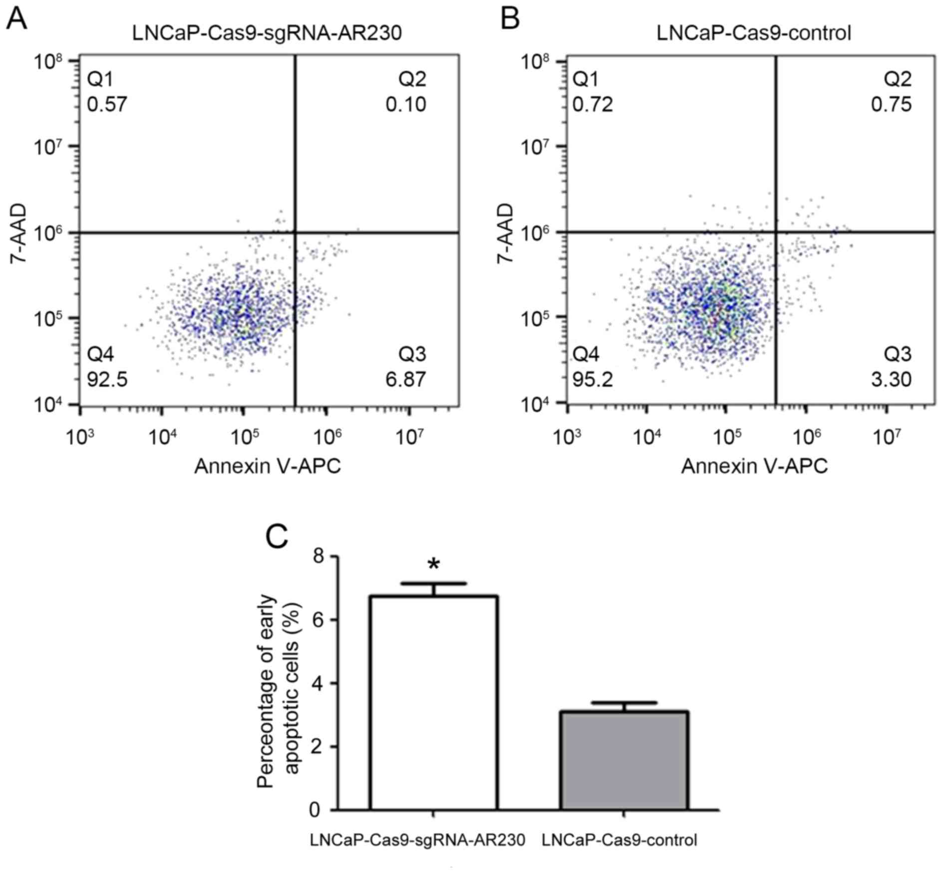 Cellular apoptosis was analysed by flow cytometry as presented in Fig. 5. To investigate whether the decreased cell proliferation was due to cellular apoptosis, flow cytometry was used to evaluate the effect of AR knockdown on cellular apoptosis. It was observed that the proportion of early apoptosis (region Q3) in the LNCaP-Cas9-sgRNA-AR 230-treated cells was increased compared with that induced by the LNCaP-Cas9-control treatment (6.87% vs. 3.30%). The difference between the two groups was statistically significant (P<0.05) according to the results of a two-tailed Student's t-test.