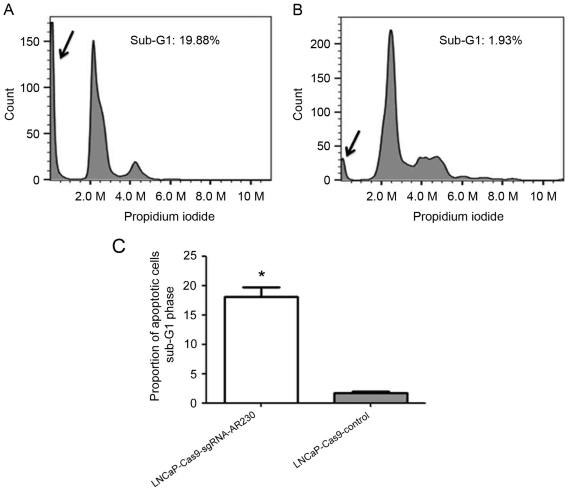 For the cell cycle assay, the LNCaP-Cas9-sgRNA-AR230 and LNCaP-Cas9-control cell samples were washed twice with 1 ml cold PBS buffer, and the cells were fixed in 70% ethanol for 12–24 h at −20°C. The cells were washed with cold PBS buffer and stained with 500 µl PI at 37°C in the dark for 30 min. The analyses were performed using a CytoFLEX flow cytometer (Beckman Coulter, Inc.). The percentage of cellular apoptosis was calculated according to the percentage of the sub-G1 peak in the cell cycle profile following the PI staining (15).