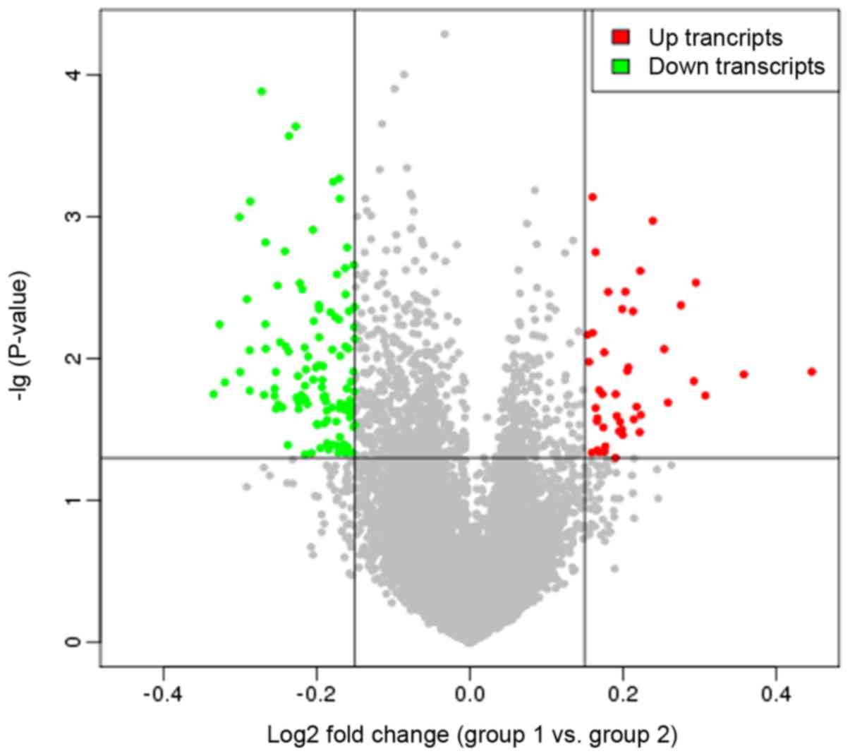 Following implementation of the DEDS algorithm, a total of 44 upregulated and 117 downregulated genes were identified in the recurrent samples relative to the non-recurrent samples, with more downregulated genes identified compared with upregulated genes. Additionally, a volcano plot was constructed to examine DEG expression distributions (Fig. 1).