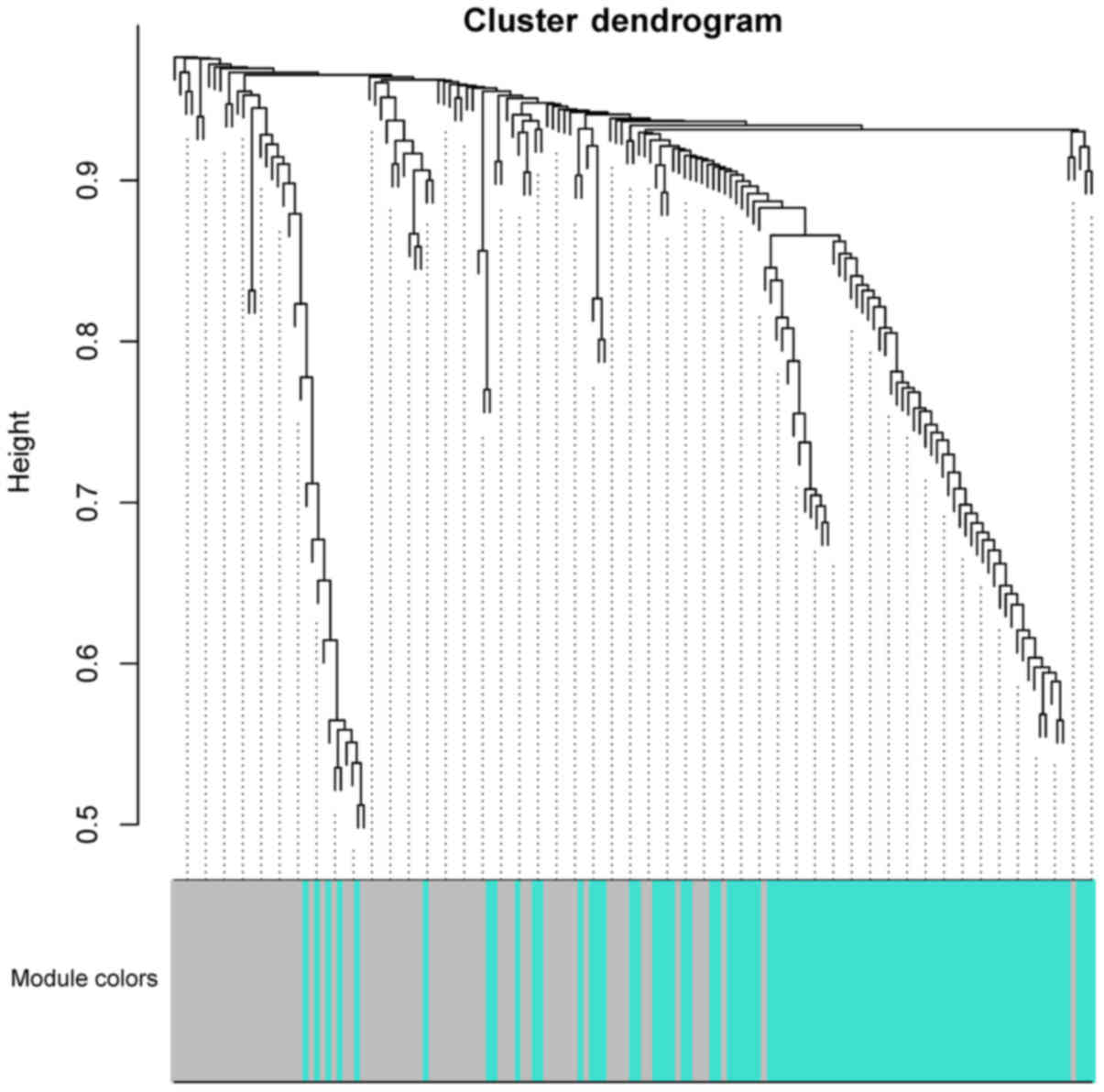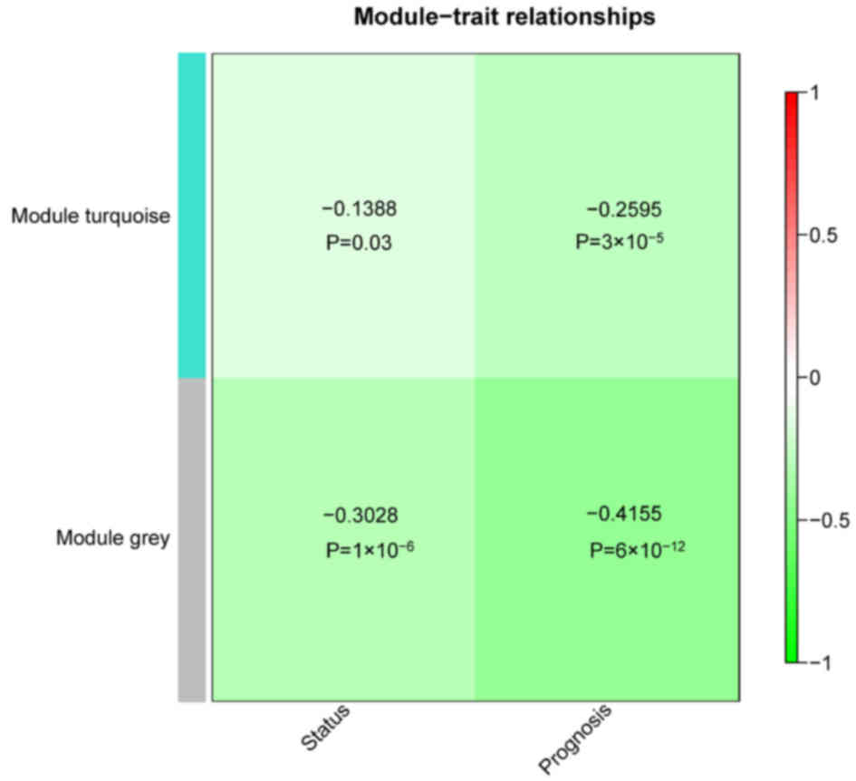 WGCNA was performed and turquoise and grey modules were identified within the cluster dendrogram (Fig. 2). Within the turquoise module, 87 genes were identified (14 upregulated and 73 downregulated), while in the grey module, 74 were identified (30 upregulated and 44 downregulated). Correlations between the two modules regarding status/prognosis were also analyzed. The results demonstrated that the two modules had significant correlations with status and prognosis (P<0.05; Fig. 3). Furthermore, sample correlations were further examined via heatmap analysis, and it was indicated that the samples in the turquoise module were more strongly correlated when compared with those in the grey module (Fig. 4).