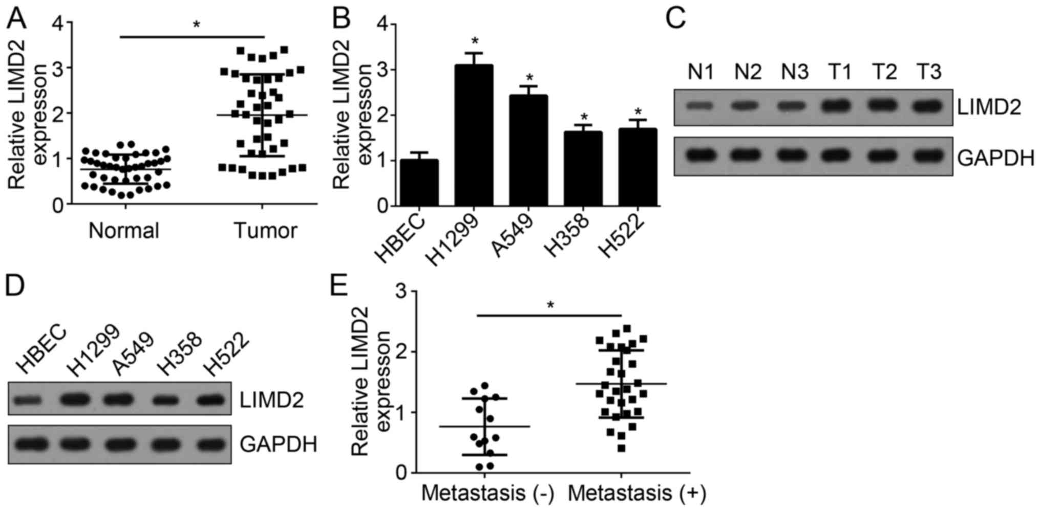 To investigate the function of LIMD2 in NSCLC, the expression levels of LIMD2 were determined by RT-qPCR. The present study reported that LIMD2 expression levels were significantly upregulated in NSCLC tissues (n=41) compared with in adjacent normal tissues (n=41) (Fig. 1A). Additionally, the expression levels of LIMD2 in NSCLC cell lines were determined. The results indicated that the expression levels of LIMD2 were significantly upregulated in NSCLC cell lines, including H1299, A549, H358 and H522 cells, compared with human bronchial epithelial cells (HBECs) (Fig. 1B). Consistently, the protein expression levels of LIMD2 in NSCLC tissues and cell lines were notably upregulated compared with in normal tissue and HBECs, respectively (Fig. 1C and D). In addition, the present study reported that LIMD2 expression levels were significantly higher in NSCLC tissues with metastasis than tissues without (Fig. 1E). These data suggest LIMD2 may be involved in NSCLC progression.