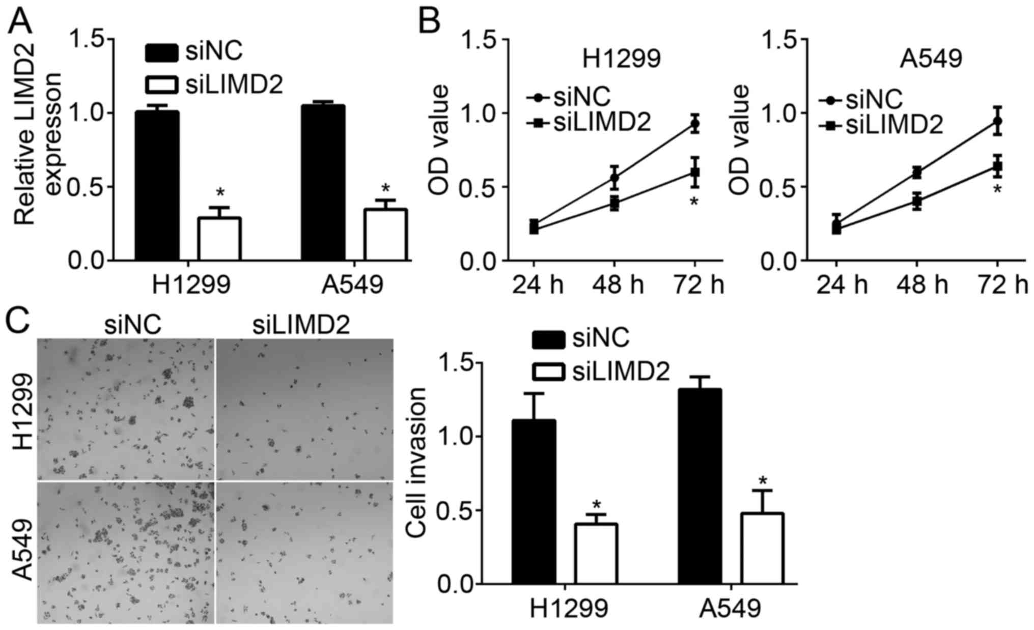 To determine the effects of LIMD2 on NSCLC cells, LIMD2 expression was downregulated in H1299 and A549 cells via transfection with specific siRNAs. RT-qPCR analysis revealed that the expression levels of LIMD2 were significantly downregulated in H1299 and A549 cells transfected with siLIMD2 compared with in the control group (Fig. 2A). The present study also performed CCK-8 and Transwell assays to determine the effects of LIMD2 on cell proliferation and invasion, respectively. The CCK-8 assay indicated that knockdown of LIMD2 significantly suppressed the proliferation of NSCLC cells at 72 h compared with in the control group at 72 h (Fig. 2B). Furthermore, the present study reported that LIMD2 silencing significantly reduced the number of migrated cells compared with in the control group (Fig. 2C). The above data indicated that LIMD2 contributes to NSCLC progression.