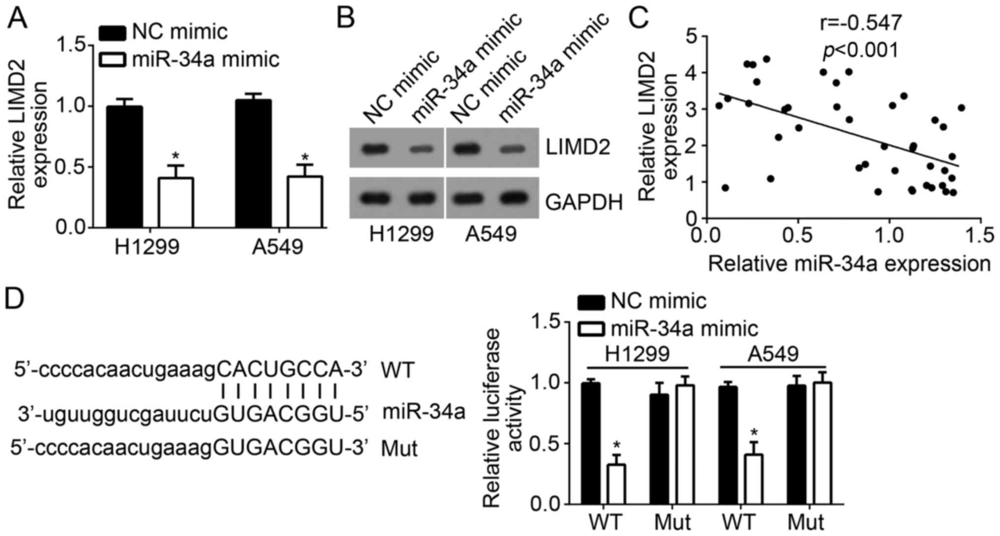 The present study investigated the mechanism underlying the regulation of LIMD2 expression in NSCLC cells. The results demonstrated that overexpression of miR-34a significantly suppressed the mRNA expression levels of LIMD2 in H1299 and A549 cells compared with in the control (Fig. 3A). Additionally, western blot analysis revealed that ectopic expression of miR-34a markedly decreased the protein expression levels of LIMD2 in H1299 and A549 cells compared with in the control (Fig. 3B). Furthermore, an inverse correlation between the expression of LIMD2 and miR-34a was observed in NSCLC tissues (Fig. 3C).