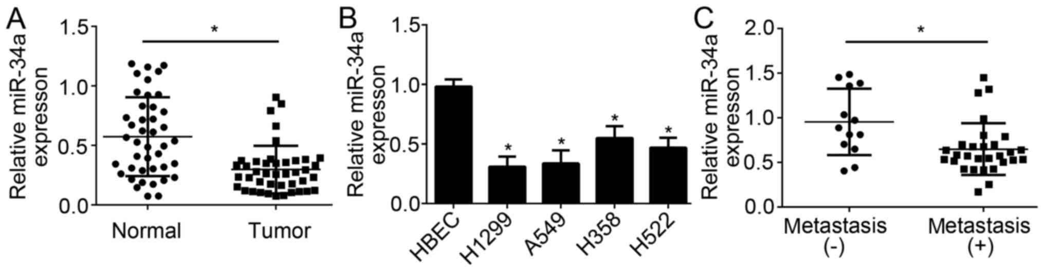 LIMD2 was proposed to act as an oncogene in NSCLC in the present study; however, miR-34a inhibited the expression of LIMD2 in NSCLC cells. To determine the role of miR-34a in NSCLC, the expression levels of miR-34a were determined by RT-qPCR. The results demonstrated that miR-34a expression levels were significantly downregulated in NSCLC tissues compared with in adjacent normal tissues (Fig. 4A). Additionally, lower expression levels of miR-34a were observed in NSCLC cell lines compared with in HBEC cells (Fig. 4B). Furthermore, the expression levels of miR-34a were significantly lower in NSCLC tissues with metastasis compared with in those without metastasis (Fig. 4C). These data implied that miR-34a may be a tumor suppressor in NSCLC.