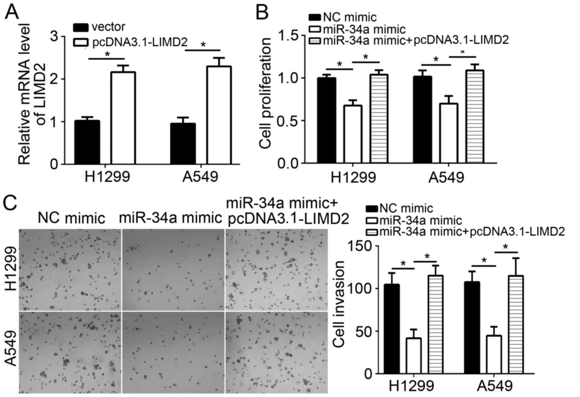 The present study investigated whether the effects of miR-34a on NSCLC cells are associated with LIMD2. RT-qPCR analysis indicated that the overexpression of LIMD2 significantly increased the mRNA expression levels of LIMD2 in H1299 and A549 cells compared with in the vector-transfected group (Fig. 5A). CCK-8 and Transwell assays revealed that the overexpression of miR-34a significantly suppressed the proliferation and invasion, of NSCLC cells respectively, compared with in the control group (Fig. 5B). Of note, restoration of LIMD2 expression significantly reversed the inhibitory effects of miR-34a on H1299 and A549 cell proliferation and invasion compared with in the miR-34a overexpression group (Fig. 5B and C). Taken together, the data from the present study demonstrated that miR-34a suppressed NSLCL progression through targeting LIMD2.