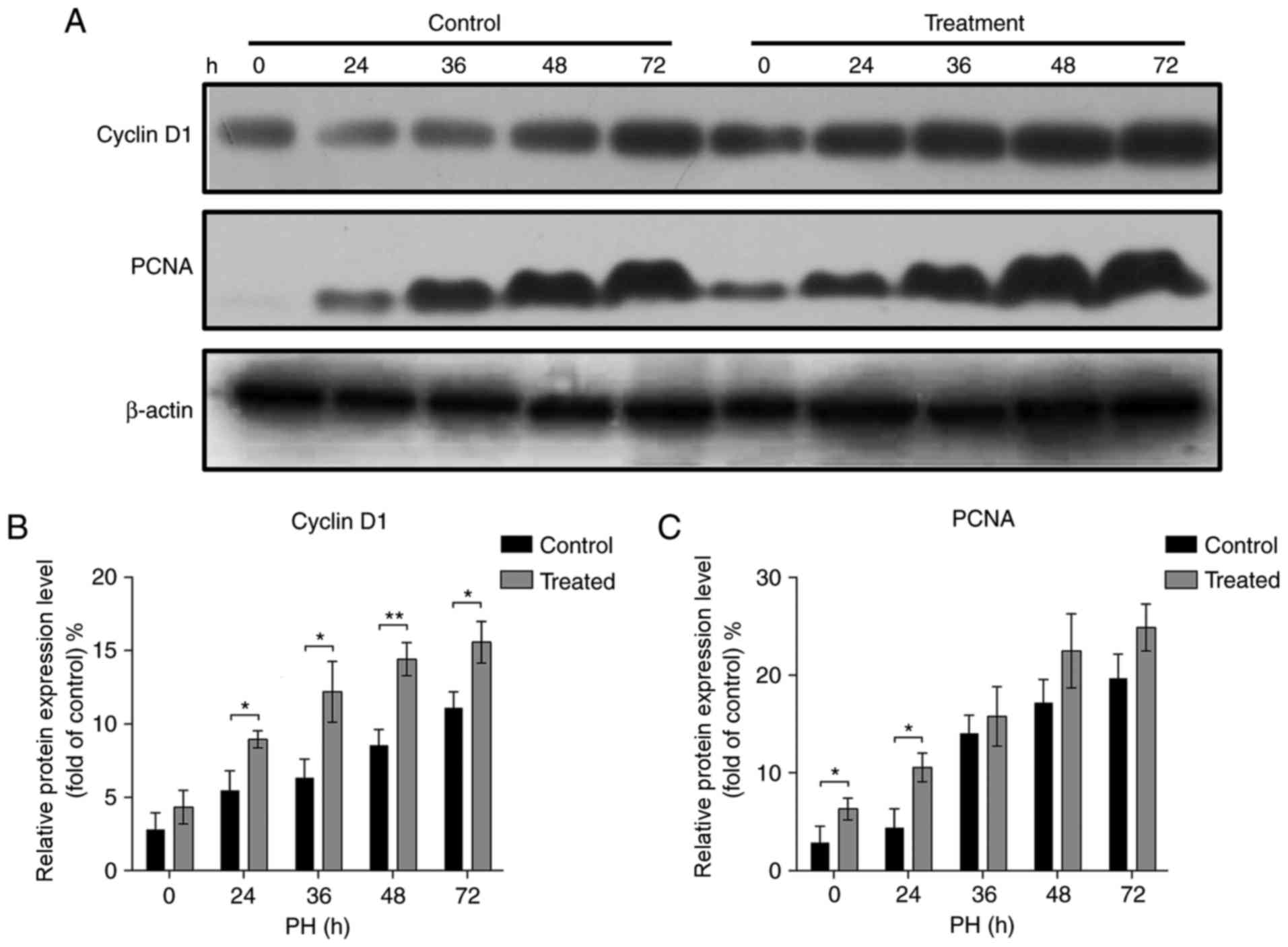 Cell cycle progression serves a vital role during liver regeneration (30). To examine the cell cycle of proliferating hepatocytes following PH, the expression of G1/S-specific cyclin D1 and proliferating cell nuclear antigen (PCNA), two key regulators of the cell cycle, was analyzed by western blotting (Fig. 2A). It was identified that the expression levels of cyclin D1 and PCNA reached a peak at 72 h in the livers of mice from the treatment and control groups. Additionally, the livers of mice injected with Nam exhibited significantly increased expression of cyclin D1 at 24, 36, 48 and 72 h and PCNA at 0 and 24 h when compared with the control (Fig. 2B and C; P<0.05). These results suggested that Nam may accelerate liver regeneration following PH.